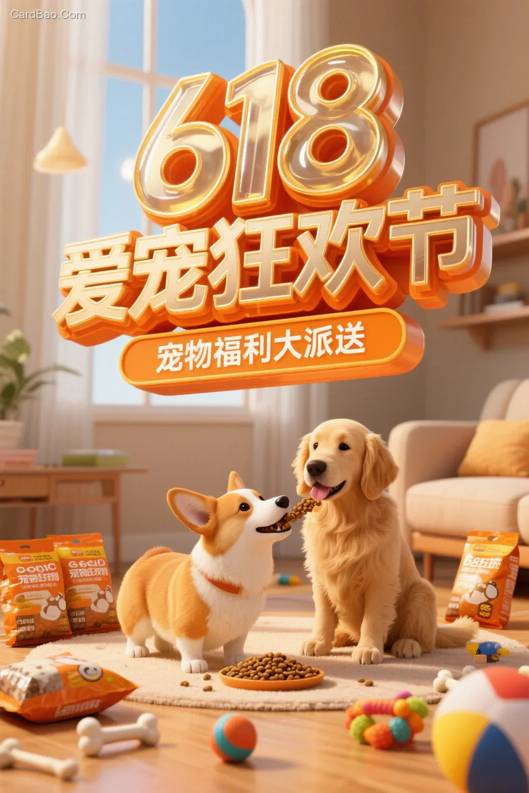 顶部大标题是“618爱宠狂欢节”,立体白色字,鎏金色边,立体字体有丰富的三层立体效果,中间是玻璃质感的凸描边,最底层是橙金色底,下方色框内是副标题“宠物福利大派送”3D风格,电商海报,冲击抬头角度。主体是两只狗一只柯基在吃狗粮,一只金毛在端坐着。背景是暖色调的客厅,客厅地上有杂乱放置的4袋狗粮、3个骨头磨牙棒,玩具球等宠物用品。色彩鲜艳,突出618大促狂欢氛围。