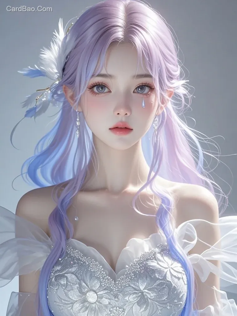 背景透明,大家闺秀,亭亭玉立,华丽光影 ,高雅气质,柔和灯光,8K超清画质,身着雪纱长裙,银丝刺绣花瓣纹路,衣袂飘动透光;苍白肌肤带泪痕,粉蓝色长发,瞳孔浅金色;浅色羽毛发饰,发光的眼睛,半身镜头,流体艺术,高细节,仙气,纱制衣服。楚楚可怜,忧郁,香肩微露,近景,面部特写