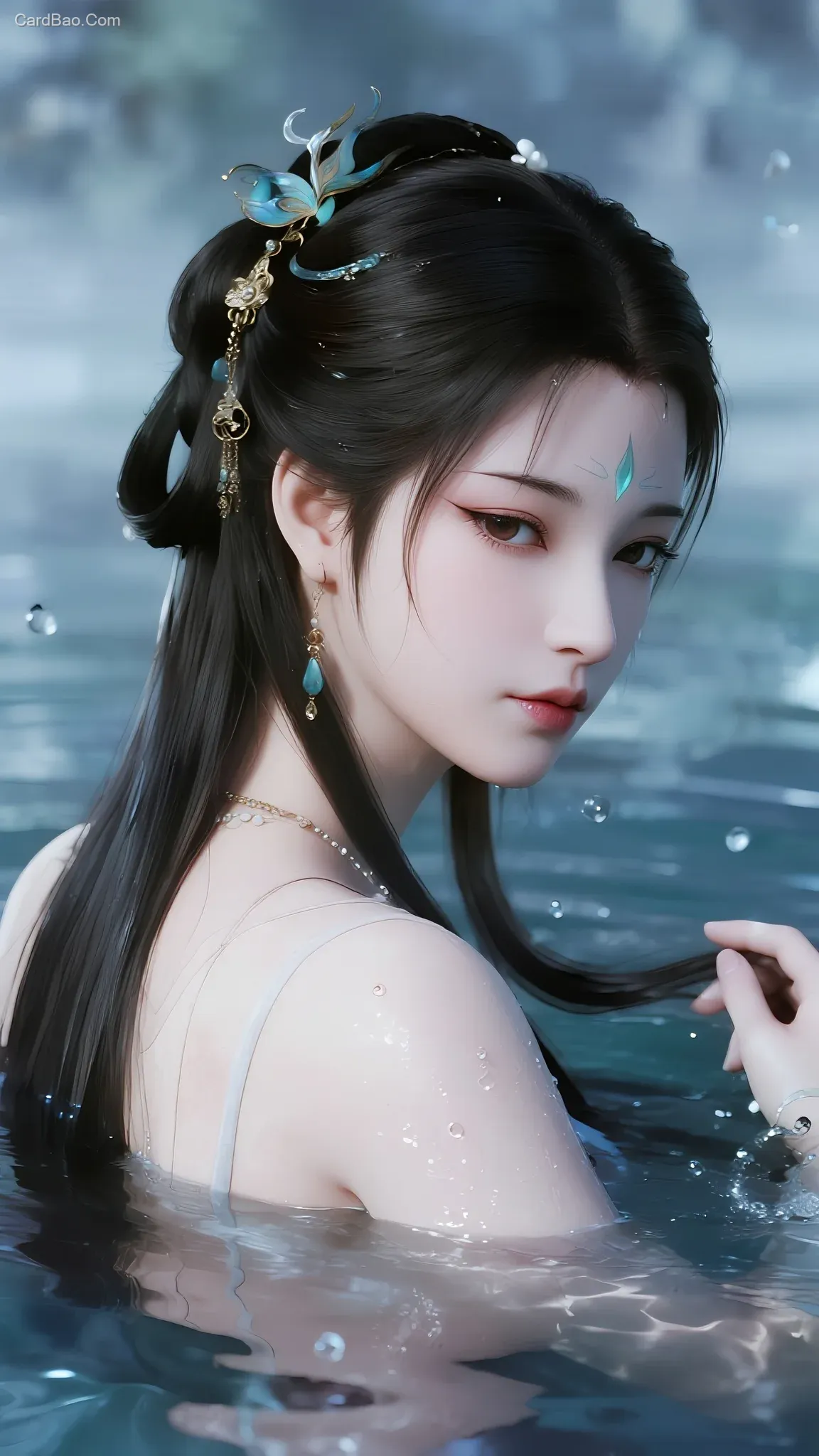 Generate an image: Create a 3D Chinese animation-style image of Qianye Ying'er in a 9:16 aspect ratio. The overall aura should be divine, cool, and mysterious, with the authoritative presence of a superior. Her facial features are exquisite, with eyes that hold the charm of a starry sea and a complex expression. She has a perfect oval face with radiant, holy skin, and her lips are beautifully shaped with a soft, light color. Her figure is slender and graceful, with excellent proportions and elegant curves that carry a heroic spirit. Her posture is elegant, embodying the noble dignity of a goddess, with dynamic beauty in her movements. Her jet-black hair is soaked and cascades down to her waist, interacting with her skin and water droplets, accompanied by an identity halo and mystical runes. The accessories are simple yet luxurious, such as a divine mark on her forehead and fragments of spiritual objects in her hair. Set in a bathing scene, use lighting, shadows, and material rendering to create a stunning and breathtaking visual effect. Aspect ratio: 9:16.