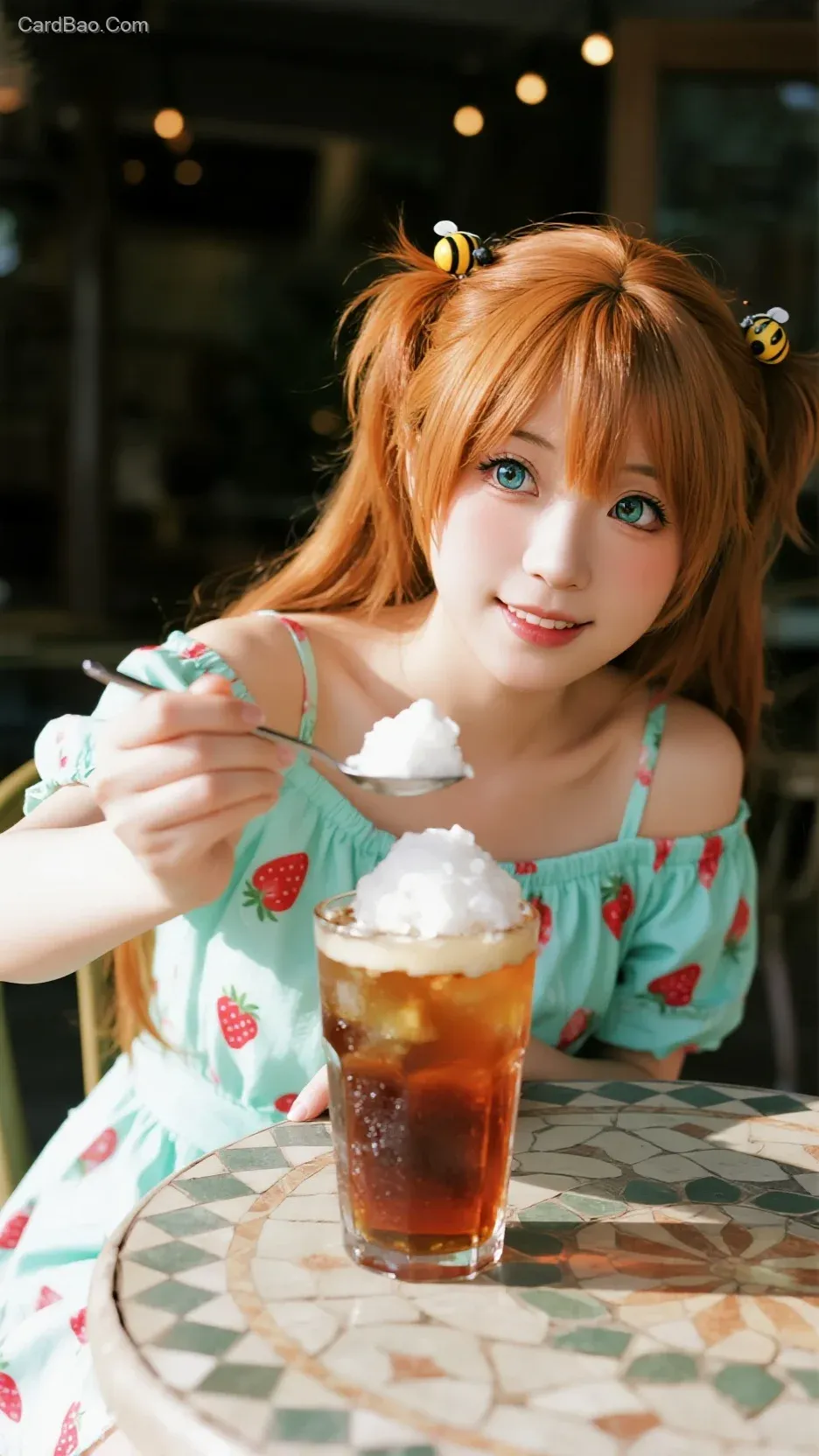 (Summer Pure Desire Style), (Cosplay: Asuna in casual modern ver.), beautiful woman sitting at retro outdoor cafe, wearing off-shoulder mint sundress with strawberry print, stirring iced tea with long spoon, condensation on glass reflecting sunlight, leaning forward slightly revealing subtle cleavage, hair adorned with tiny honeybee hairpin, offering a spoonful of shaved ice to viewer with warm eyes, faint blush, bokeh string lights in background, focus on glossy lips and shoulder curve, summer afternoon ambiance, anime style.