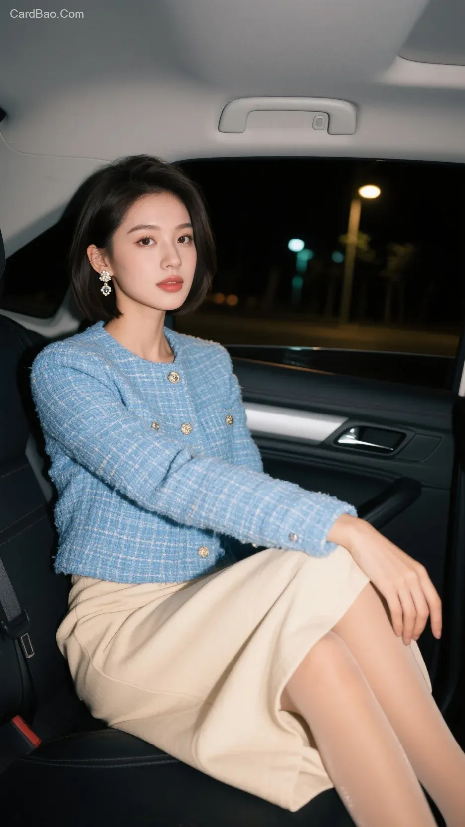 A young woman with short hair, wearing delicate makeup and ear accessories, dressed in a blue tweed top and a beige long skirt, paired with flesh-colored stockings, sitting inside a car with the nighttime scenery outside the window as the background, exuding a style that is fashionable, elegant, refined, and sophisticated.
