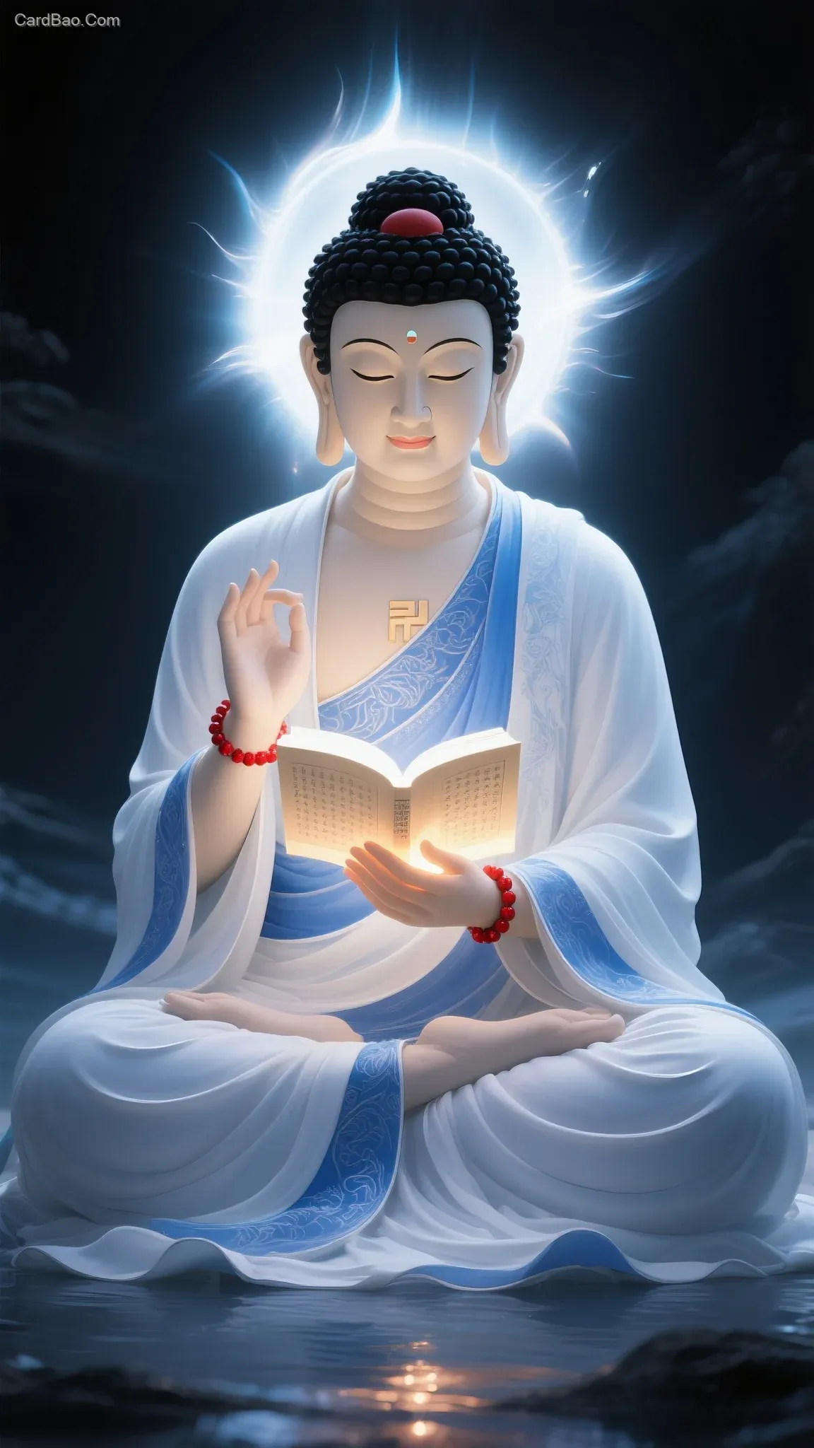 Blue and white gauze-clad Buddha, holding a glowing scripture, with black hair tied in a bun, seated in a full-body posture, wearing a red bracelet, set against a dark background with flowing light, the other shore, in a posture of worship, surrounded by Buddha's light, flawless, with clearly defined ears, in a high-quality artistic scene.