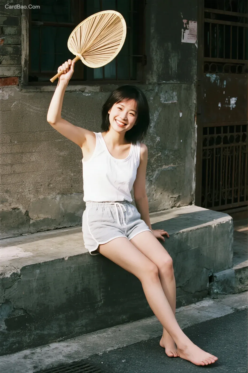 A young woman, wearing a white sleeveless top and light gray shorts, sits barefoot on a low gray cement wall. She holds a palm-leaf fan high in her right hand, smiling brightly and naturally. The background features a mottled, aged wall and an iron door, exuding a sense of everyday life. The style is Japanese-inspired and fresh, with a natural and simple color palette dominated by white and light gray, complemented by the warm gray of the cement wall. Soft, even side lighting creates a relaxed atmosphere. The shot is taken at eye level with a 35mm focal length, using a centered composition to highlight the subject, while a shallow depth of field blurs the background details. The image is in high-quality 8K resolution, with true-to-life color reproduction, emphasizing the folds of the clothing and the texture of the wall.