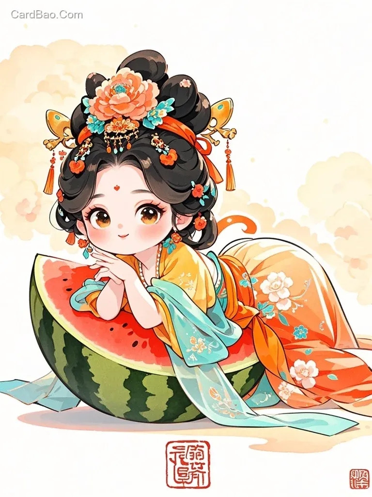 中国古风Q版卡通漫画风格,一位超级可爱的贵妃,穿着华丽的唐代贵妃服饰,梳着贵妃发髻,头上戴着精致的发饰,趴在圆圆的大西瓜上,正侧面照,仙气飘飘,人物小点儿,表情是妩媚俏皮的,半身照,整体和谐,水彩风格,幻,白色背景,配色和谐,暖色系水彩晕染,大面积留白
