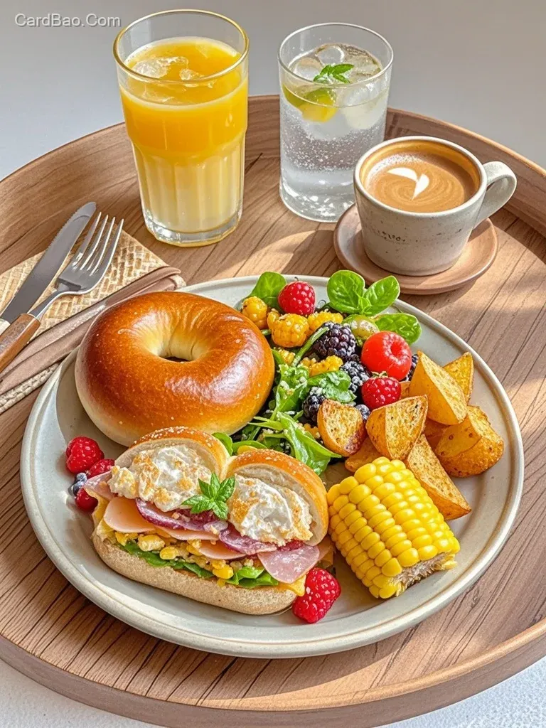 手绘漫画动漫插画,元气brunch🥯贝果三明治虾仁烤薯角🥗美式🍊 🍽️食物满满的早餐拼盘~ 搭配冰冰的橙汁美式 消暑解腻🍊 食材:🥯 贝果➕生菜➕芝士片➕蟹柳煎蛋➕虾仁➕烤肠➕牛油果➕烤薯角➕玉米➕莓果 咖啡:🍊 马蹄珠珠➕冰块➕橙汁➕气泡水➕意式咖啡液。高清,画面干净,精致,还特别有食欲。小资轻奢高级网红风