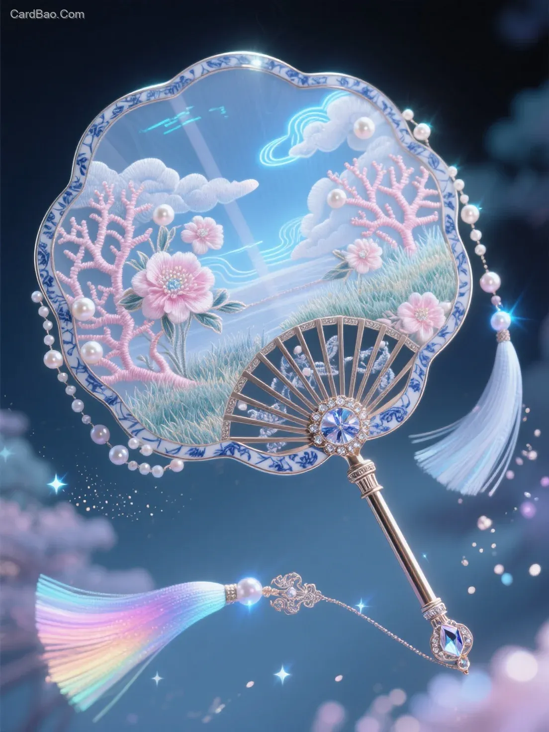 The new Chinese-style fan features a liquid metal silk gauze base, with photon-embroidered coral patterns forming a dynamic, growing holographic design of pearl-pink flowers and grass. Nanoscale laser engraving embeds smart color-changing stamens within the cloud motifs in the sky. The magnetron-coated fan ribs emit a blue-and-white porcelain crackle light effect, while suspended pearl particles encircle the fan edge to form quantum-state tassels. Bionic silk embroidery layers are loaded with photon growth special effects, and an intelligent sensing light source projects sky-blue ripple patterns onto the fan surface. The diamond-inlaid fan handle contains miniature holographic Greek column decorations, and the gradient iridescent tassels release trails of stardust particles with movement.