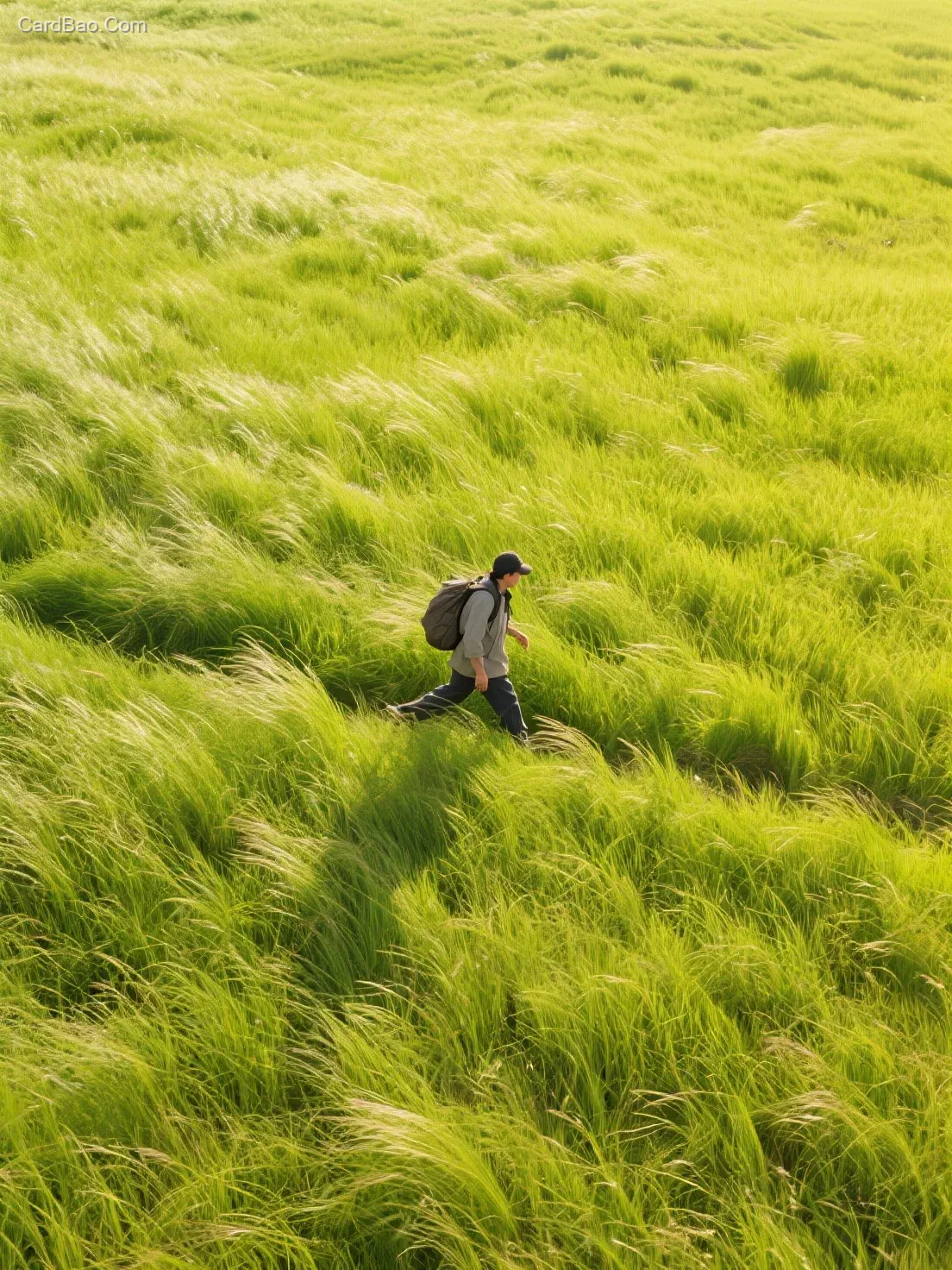 航拍,俯瞰,色彩十分浓厚,色彩饱和度极高。风吹拂着长长的连绵的草,一位旅行者在草中艰难地逆风而行。