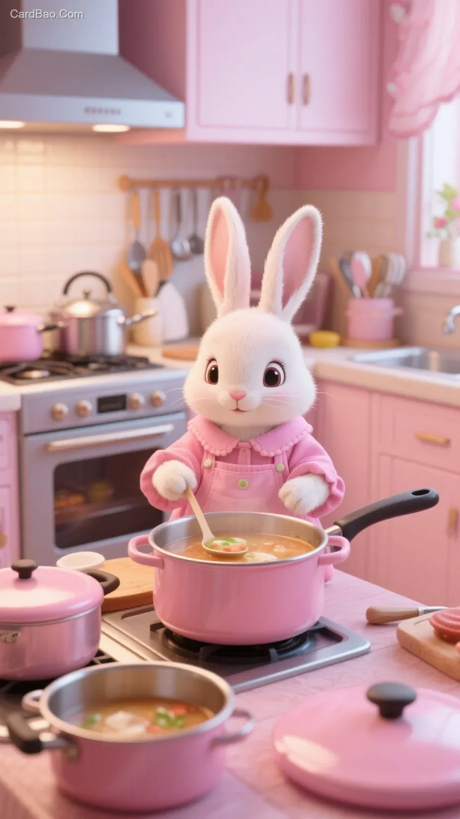 一只小兔子穿着粉色的衣服,在现代厨房里做饭,煲汤