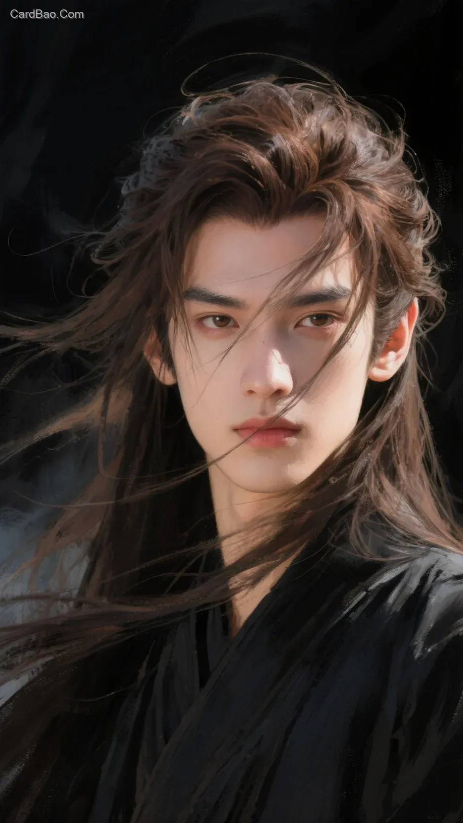 帮我生成图片:画面运用中世纪油画风格,展示了一位18岁的古风男子,棕色的垂腰乱发,发丝细致地描绘,部分凌乱发丝遮挡着脸。他身着黑色劲装,在大风的场景下进行近景头部特写。脸部高光突出,眼睛明亮有光,面容冷峻,眼神锐利,给人一种能看穿一切的神秘感。背景为黑色,通过晕染营造出唯美的氛围,细节精致,笔触细腻。图片风格为写真,比例 9:16。