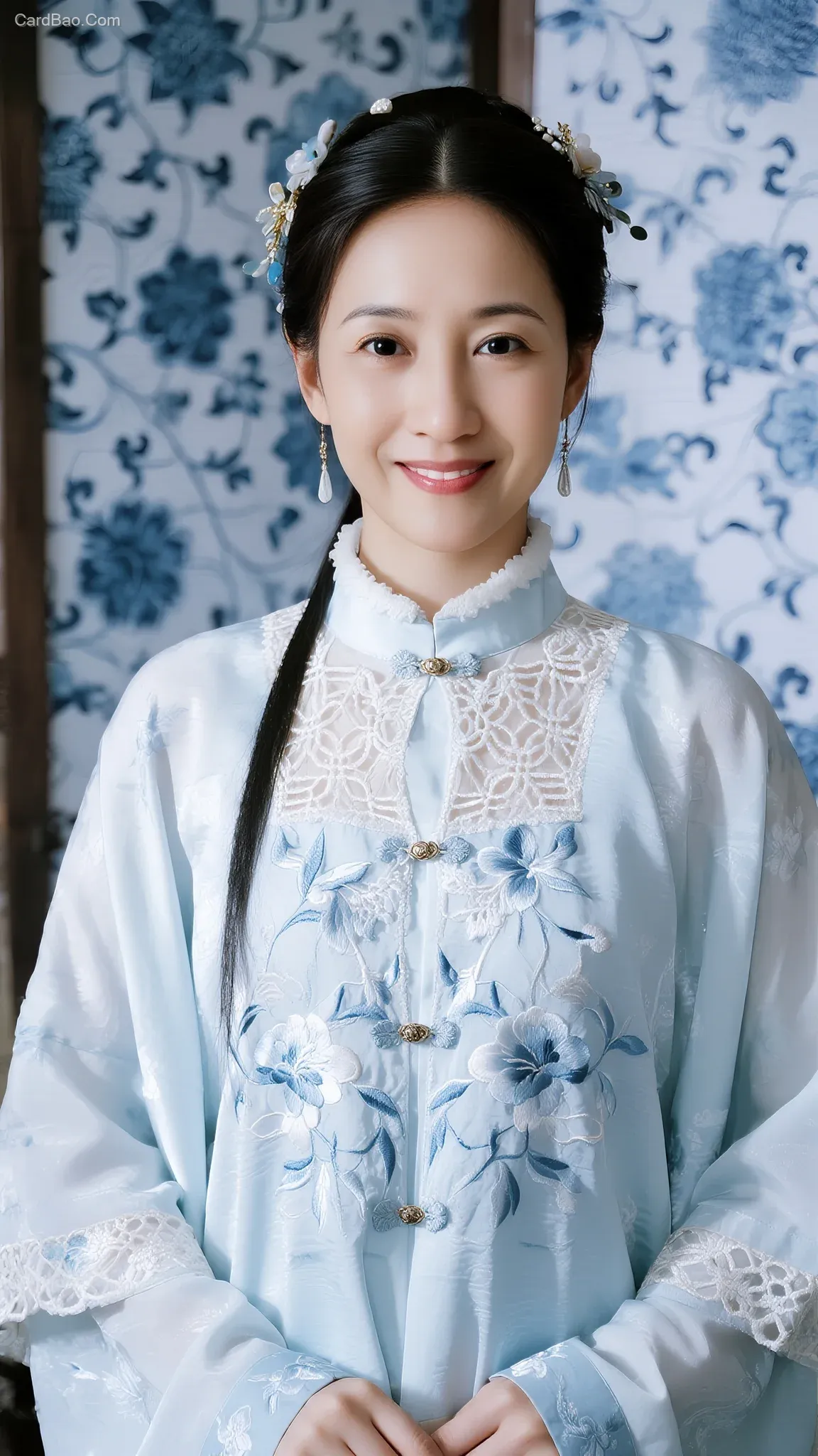 中国传统婚服形制,钩织工艺,立领配盘扣。将色调换成青花瓷的青白色系,用细腻钩织呈现镂空纹理、立体花型,喇叭袖设计。打造传统雅致又独特清新的中式礼服,用于备婚场景,展现东方美学 ,画面质感写实、精致 。