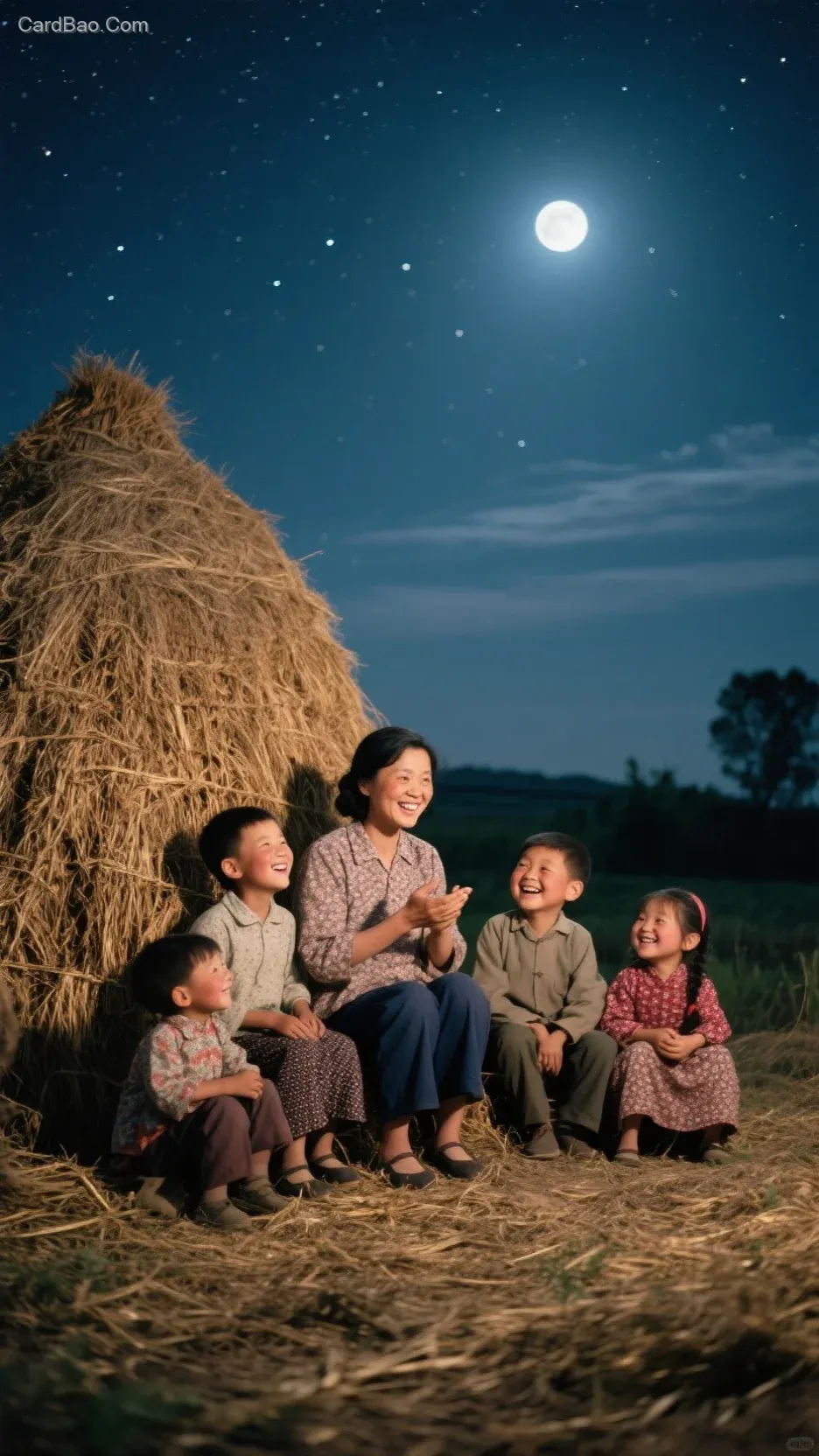 听妈妈讲那过去的事情,她们都满脸笑容,背景是高的谷堆旁边,