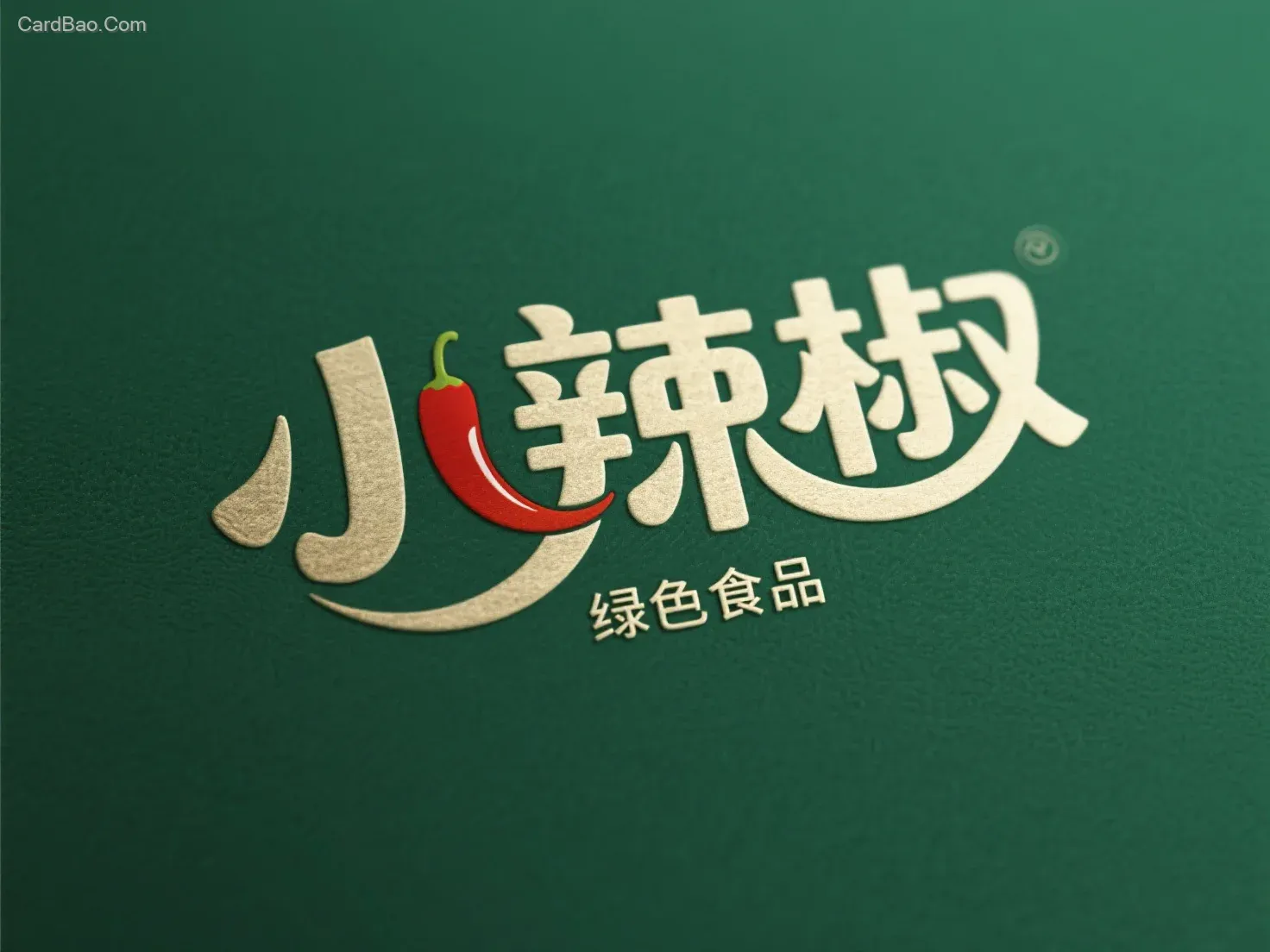 Creative font design logo. Chinese characters "小辣椒" (Little Chili). The lines should be smooth, flowing, and artistic, with abstract deformation of the characters to create an ambiguous effect. The ending stroke of one character should seamlessly connect to the starting stroke of the next, allowing adjacent characters to share and borrow strokes. The design should form a cohesive and compact whole, with interconnected strokes between the characters. It should convey a sense of sophistication, adopt a flat design style, and showcase ingenious creativity. The design should incorporate embossing on paper based on the meaning of the text. The background should be deep green. Below the main text, in a smaller font at the center, include the words "绿色食品" (Green Food).