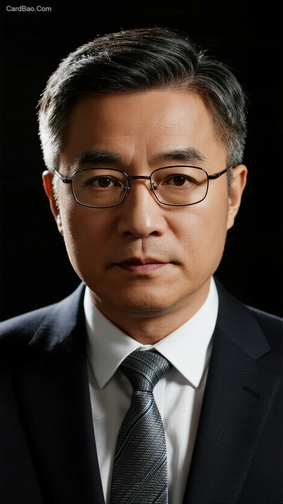 A 40-year-old Chinese man, with short hair and glasses, slight wrinkles and gray hair, wearing a shirt and tie, dressed in a suit. The background is dark, with a business photography style, professional studio lighting, real-life photography, shot with a Canon camera, high-definition digital imaging.