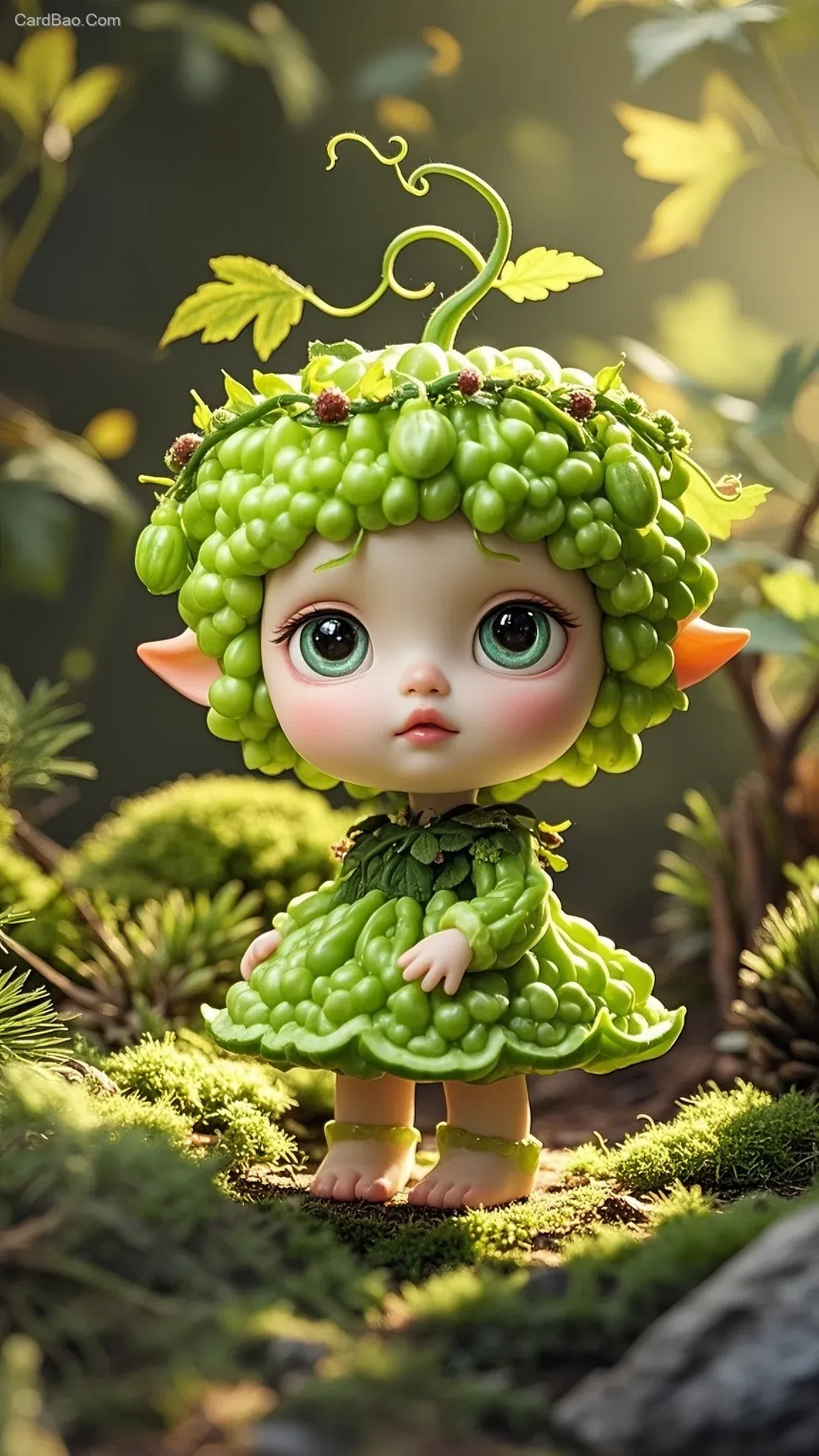 Close-up of a bitter melon fairy, with large, clear and expressive eyes, and distinct, delicate eyelashes. Its pale green cheeks are smooth and soft. The dress, inspired by the bitter melon, features a realistic texture that mimics the actual surface of the fruit, almost tangible to the touch. The bare feet are plump and adorable. On its head rests a lush wreath made of bitter melon vines and fruits, rich in intricate details. Under the dappled sunlight filtering through tree branches, pine needles and moss are clearly visible, creating a surreal and fairy-tale-like high-definition photographic scene.