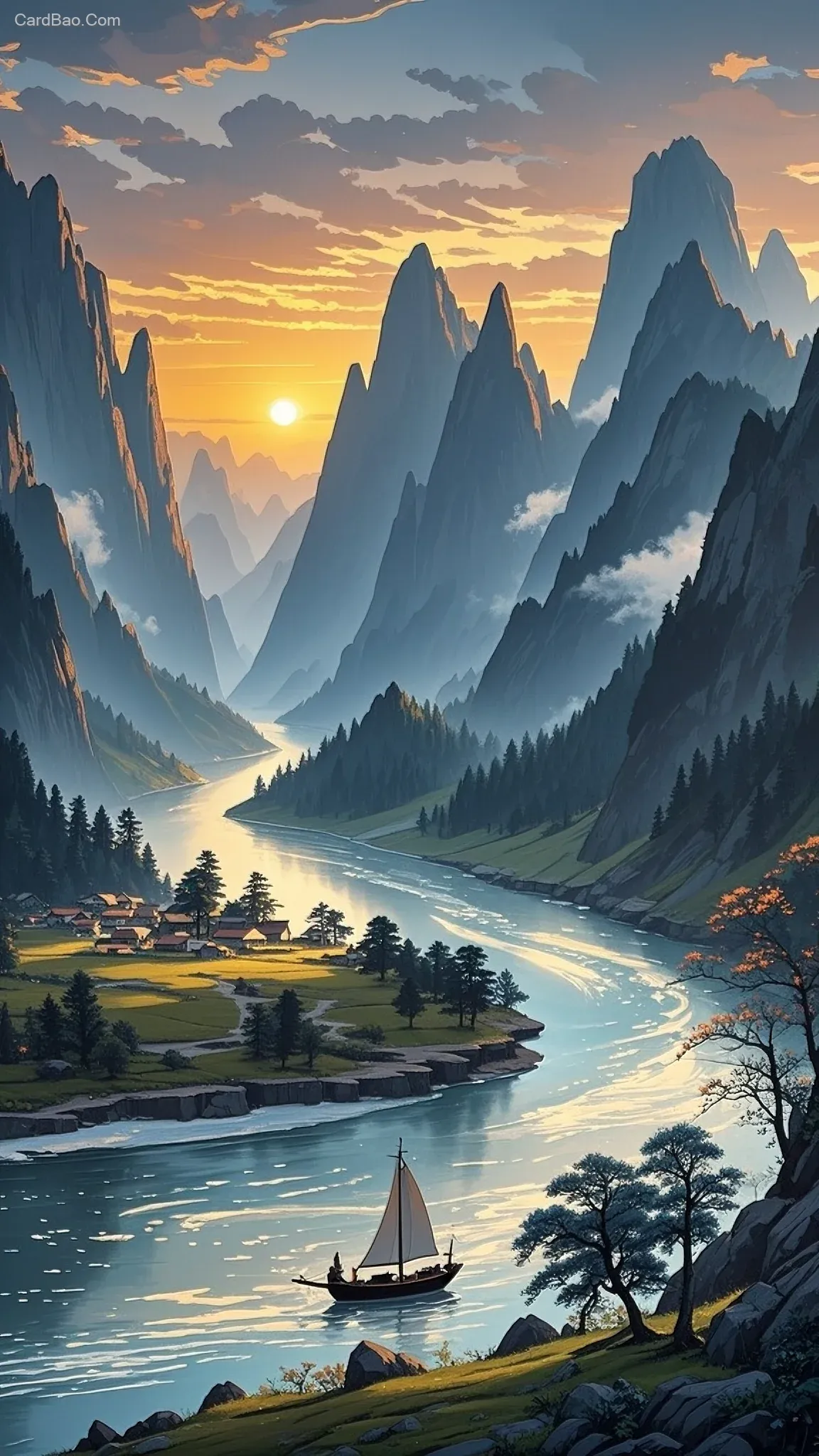苍翠山脉夹着蜿蜒向东的河流,东南方向山体豁口处有宽阔大河奔涌,稀疏寒树在遥远天际若隐若现,夕阳余晖在水面形成波光粼粼的碎片,孤零零的村落依偎在伊水岸边,单桅帆船顺风掠过泛着冷光的河面,超高清8K画质呈现全景构图,电影级青蓝冷色调与琥珀色晚霞形成冷暖对比,薄雾增强山水纵深空间感,水墨笔触融合写实摄影风格