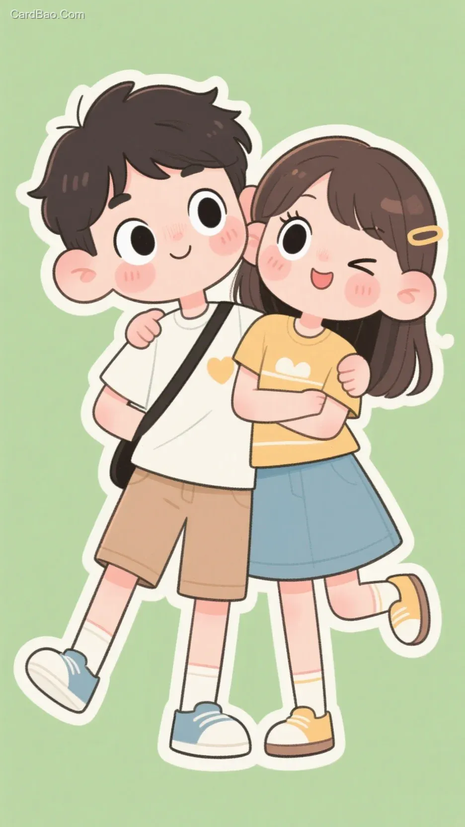 可爱甜美的情侣,手绘插画风格,平涂,半Q版,大眼,全身,搞怪,调皮,浅线勾边
