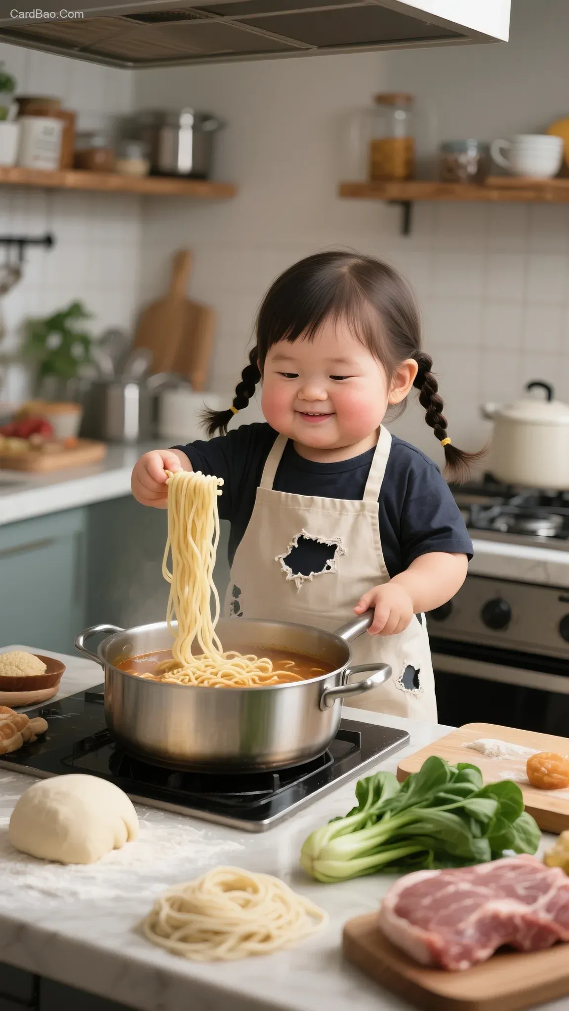 Generate a humorous-style image featuring a cute, chubby-cheeked young child with double braids, wearing a dark-colored top and an apron with a torn design, cooking noodles in a kitchen setting. The child is holding noodles in their right hand and placing them into a pot, which contains cooked noodles and broth. On the kitchen counter, display raw dough, fresh vegetables, raw meat, and other ingredients. The background should include kitchen shelves and common cooking utensils to create a busy kitchen atmosphere.