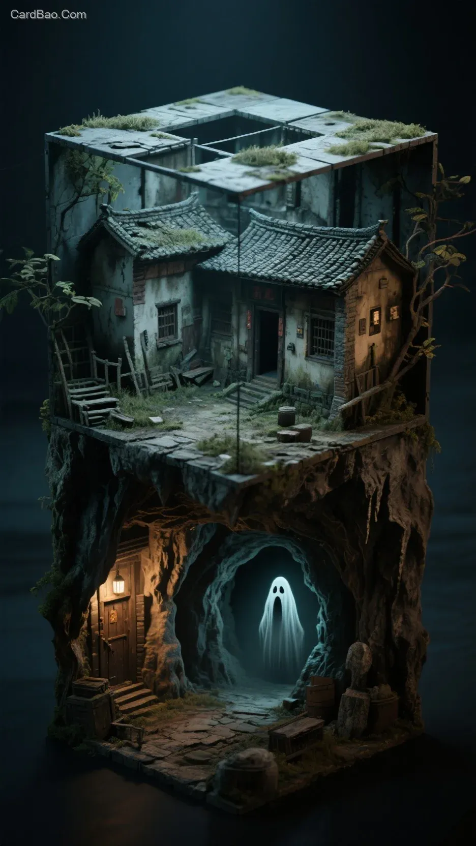 On the cubic module, present a realistic scene: surface - a desolate village and an ancient house; underground - a secret chamber, a corridor, a limestone cave, and ghosts.
