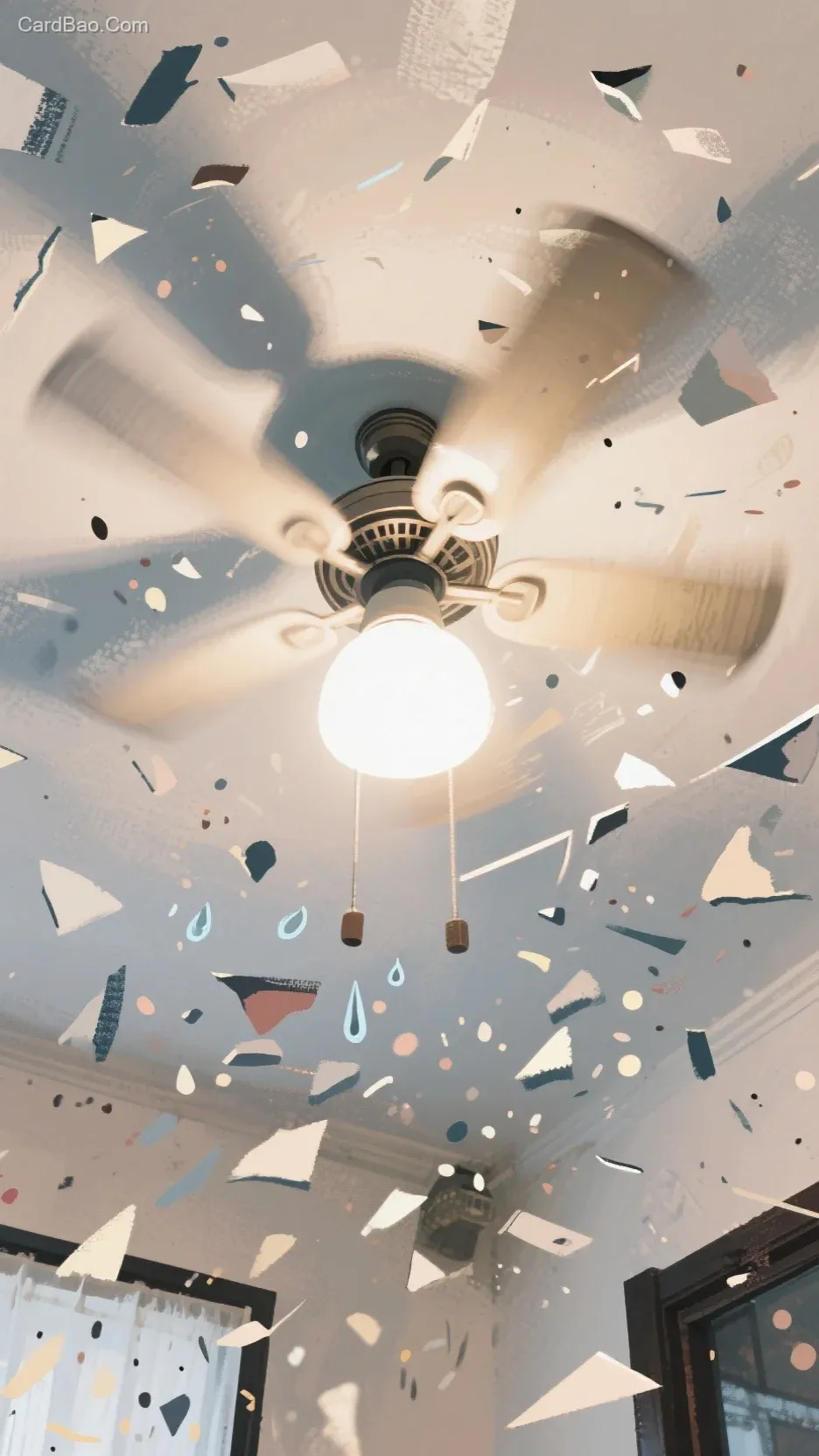 Looking up from a low angle, a rotating ceiling fan spins and spins. The overhead light shines down, casting ever-changing, swaying shadows that evoke illusions of the past—traumas, tears, successes, and failures. Fragmented collages, disordered composition, and a stream-of-consciousness style are employed. Abstract pointillism and ink-blowing techniques are used, with irregular blank spaces left intentionally. A sense of Zen permeates the scene.