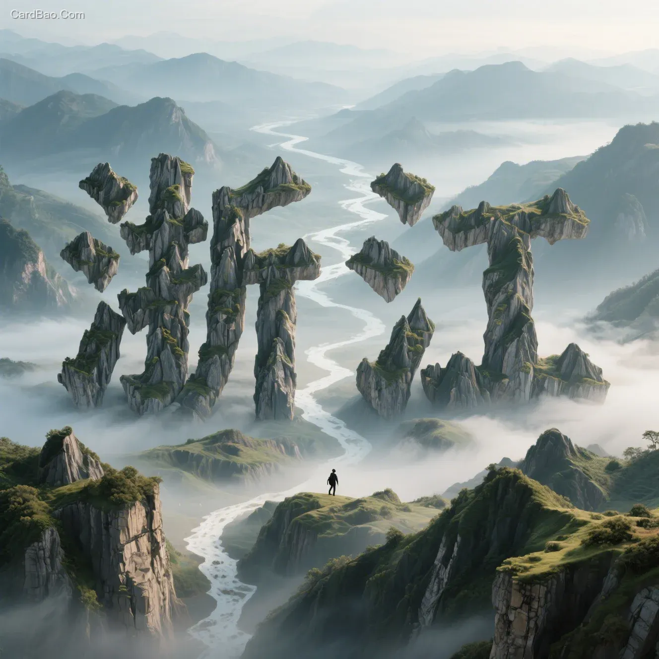 超复杂"浙江"地形景观字,每个笔画由50个独立山体自然排列,近处悬崖可见断层岩层细节,晨雾在山谷形成白色带状气流,中景徒步者仅占画面千分之一比例,3DStudioMax配合V-ray渲染16K超高清地形图,每个字的笔画都是由自然山脉元素等自然构成,没有人为痕迹,并与自然完美融合为一体,远处看,隐隐约约看得出,这些山脉河川的走向组合成了“暴富”二字。