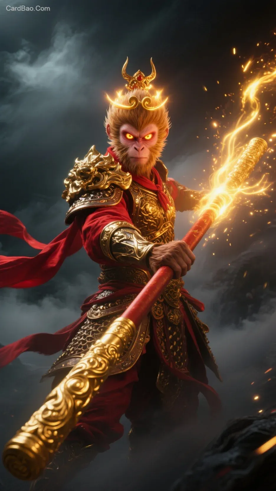 齐天大圣孙悟空高清真实,身披红色飘带粒子发光,身着铠甲发光,立于暗沉云雾间。他头戴冠饰粒子发光,威武雄壮霸气,单手紧握巨大金色金棒,棒身饰有花纹,巨大金棒一端指向镜头,气势汹汹,整体氛围神秘且充满战斗张力,尽显神话角色的霸气与威慑力 。孙悟空火眼金睛, 8K影视级画质, 金棒喷射金色能量光束, 眼睛动态粒子特效呈现能量流动轨迹, 科技感光效与古典神话元素融合