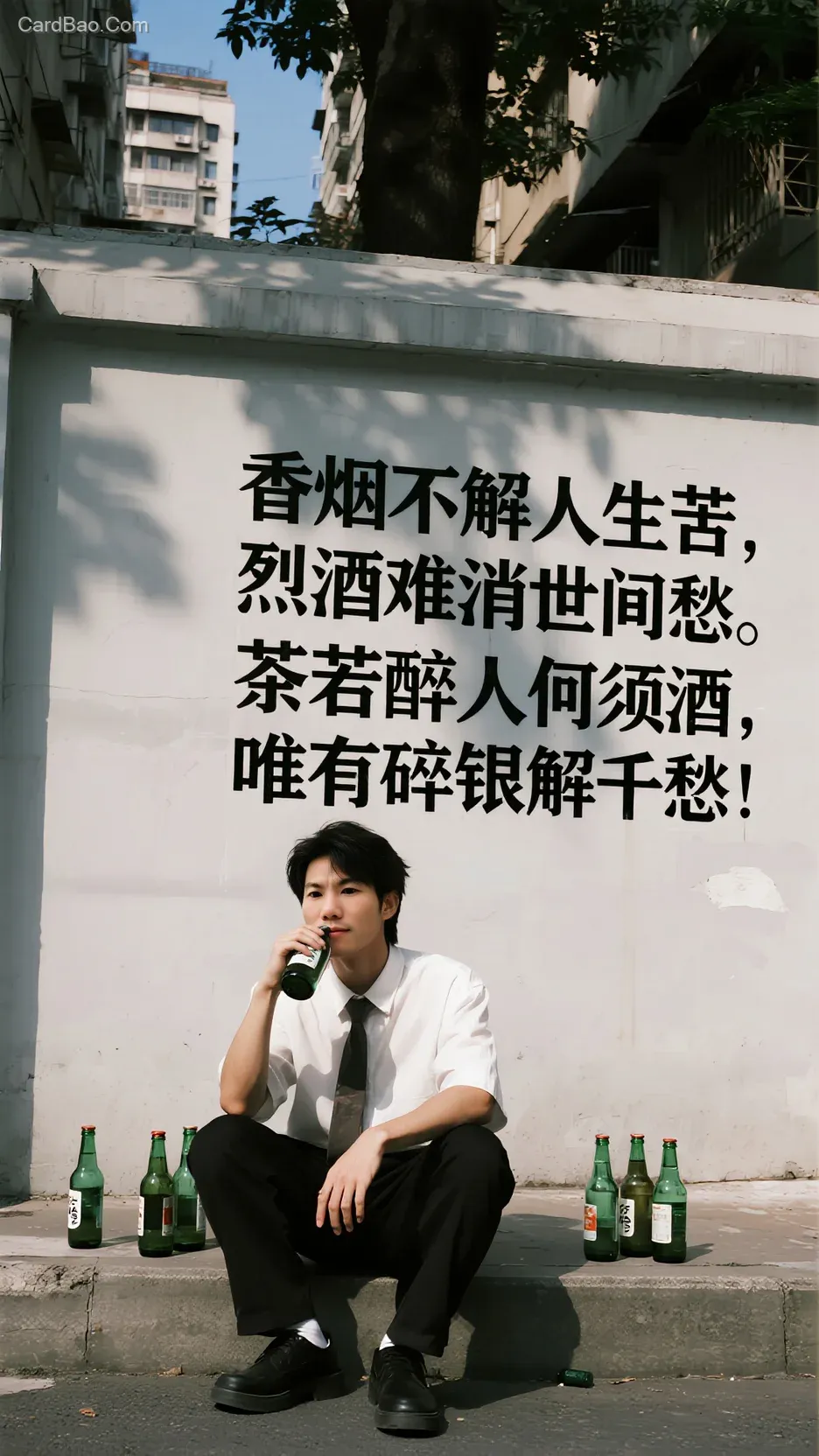 ## Daytime scene, gray-white wall with large black characters reading: "Cigarettes cannot ease life's bitterness, strong liquor fails to dispel worldly sorrows. If tea can intoxicate, why need wine? Only scattered silver can relieve a thousand worries!" Next to the wall sits a handsome young man, holding a bottle of beer and drinking. The ground is littered with scattered beer bottles. Behind the wall, there are trees, and in the distance, tall buildings can be seen. The style is realistic.