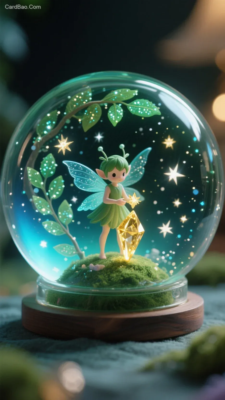 精灵的秘密家园摆件:设计一款透明的玻璃球形摆件,内部有一个小小的精灵形象悬浮在中央。从球体底部向上,色彩由深绿色渐变为淡蓝色,模拟出从森林到天空的过渡。粒子光影围绕着精灵飞舞,一部分形成闪烁的树叶形状,一部分化作璀璨的星辰。精灵面带微笑,手中拿着一颗散发着金色光芒的水晶,仿佛在守护着这片由色彩和粒子构成的秘密家园。这个摆件通过色彩渐变、粒子光影与精灵角色,构建出一个充满奇幻故事的微观世界,为家居环境增添浪漫与神秘的氛围。