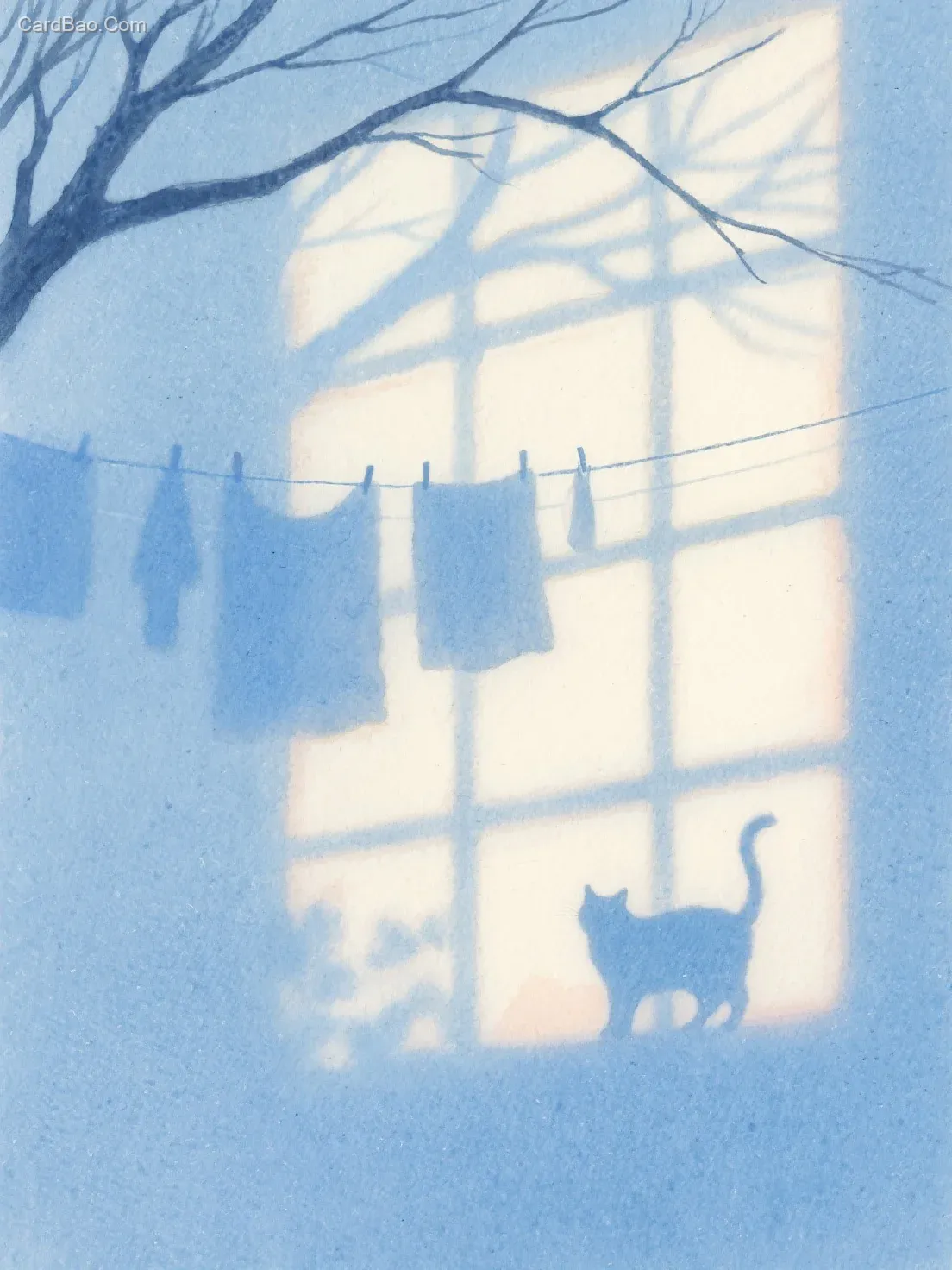 The moment when the grid-like shadows cast by the clothesline on the wall slowly crawl at dusk, the tail of a small cat, the swaying shadows of tree branches, blurred light and shadow rendered with light blue watercolor, the interweaving of loneliness and dreams, a cool color palette, dreamlike and surreal.