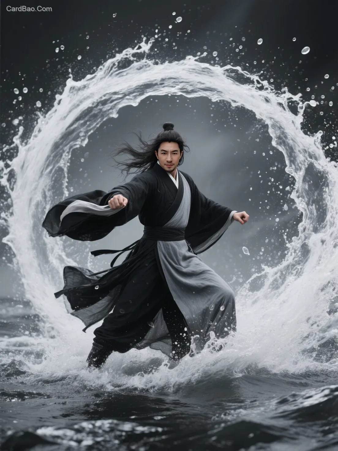 ##武侠大电影风格,身穿黑灰相间长袍男子,正面特写,俊朗,沧桑,高大霸气,长袍与散乱长发疯狂夸张地飘扬,身周汇聚出一条巨大飘逸的漩涡水流,漩涡水流缠绕身前身后并且自水中空中飘荡着大量密密麻麻的细小水滴,灰黑色氛围,马步站立,两手向前推出,旁边炸出水花。动作很拉风,脚下水面呈现巨大漩涡水流,水流随着手掌推出激荡翻滚,水面密密麻麻的水滴浮向上空。大师构图,脚下水花飞溅,极具视觉震撼,极致光影