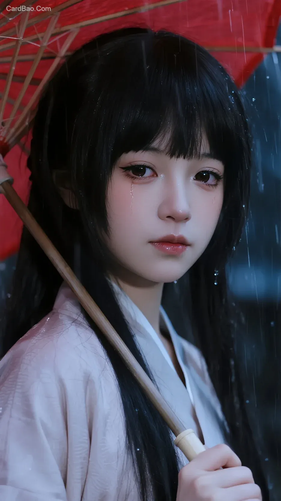 一少女cosplay魔卡少女樱真人,黑色长发搭配齐刘海,身着浅色传统服饰,手持红色油纸伞。背景为雨夜,雨滴清晰可见,环境模糊处理以突出主体。女子脸上有雨滴,眼神忧郁,传递出悲伤情绪。画面具备高分辨率,具有CG 动画般的质感,注重细节与质感,如衣物的纹理、伞面的光泽,整体氛围凄美而富有诗意,详细的面部特写,写实风格,融合写实质感与艺术化渲染,画面细腻,光影效果柔和且富有层次,营造出浓郁的情感氛围。