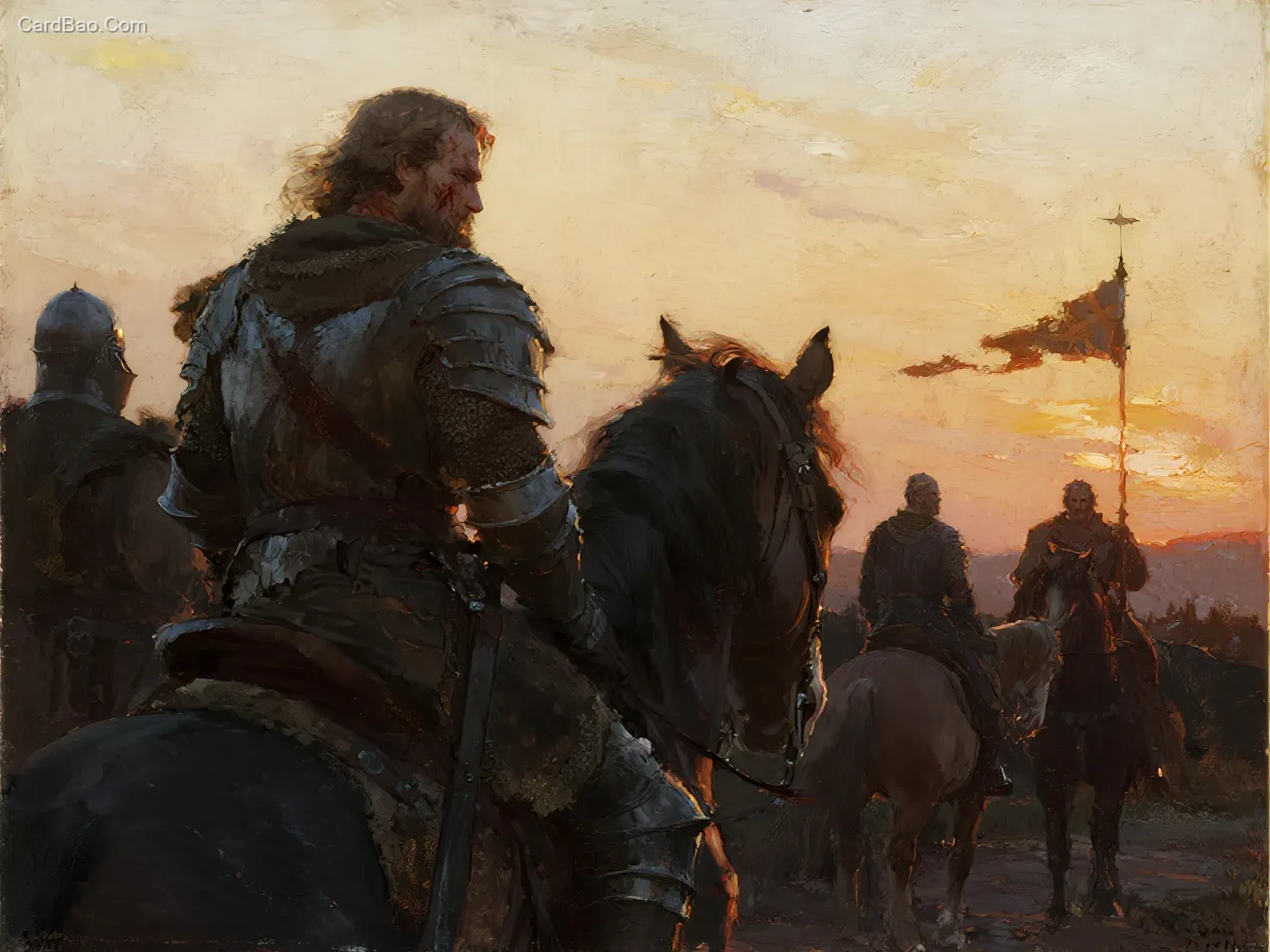 日落时分,一群从远征归来的疲惫骑士,在明亮风景映衬下,他们的神情尽显战斗的创伤。以细腻笔触和光影对比,将自然景观与人物的沧桑感结合,写实油画风格暗黑,超清画质32k