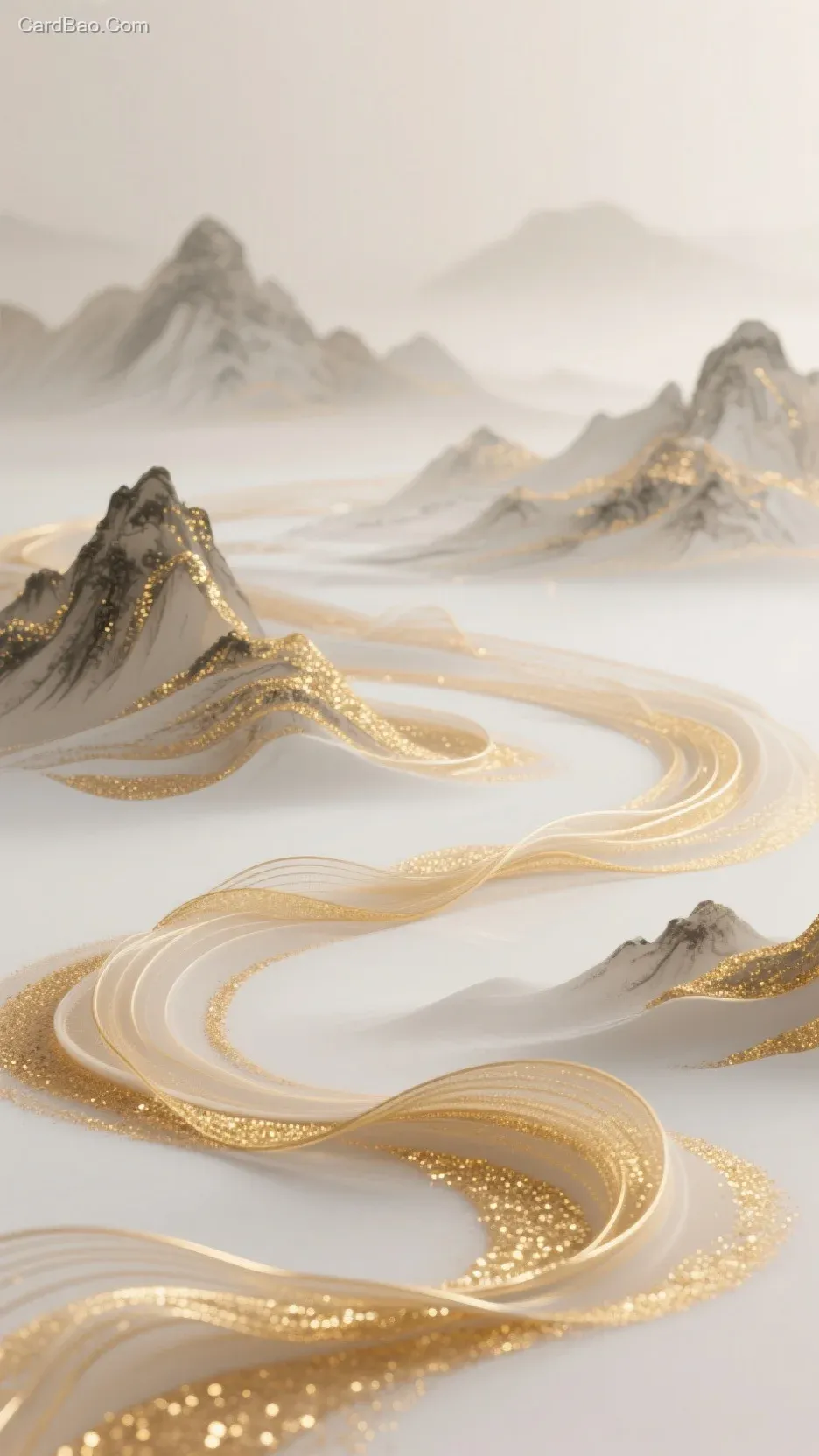 Minimalist composition, high-end feel, high-tech sand texture, Eastern aesthetics, ultra-high-definition rendering, soft light diffusion, premium elegant texture, smooth lines, strong sense of layering, winding curved composition, reflecting the blank space concept of traditional Chinese painting, gold dust accents, delicate details, a layered landscape image composed of golden threads.