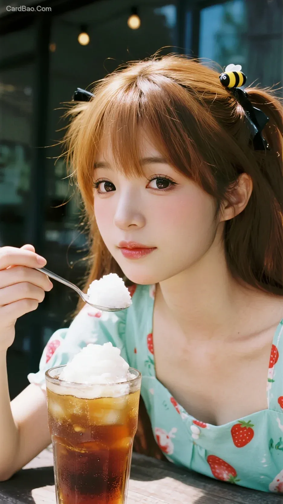 (Summer Pure Desire Style), (Cosplay: Asuna in casual modern ver.), beautiful woman sitting at retro outdoor cafe, wearing off-shoulder mint sundress with strawberry print, stirring iced tea with long spoon, condensation on glass reflecting sunlight, leaning forward slightly revealing subtle cleavage, hair adorned with tiny honeybee hairpin, offering a spoonful of shaved ice to viewer with warm eyes, faint blush, bokeh string lights in background, focus on glossy lips and shoulder curve, summer afternoon ambiance, anime style.