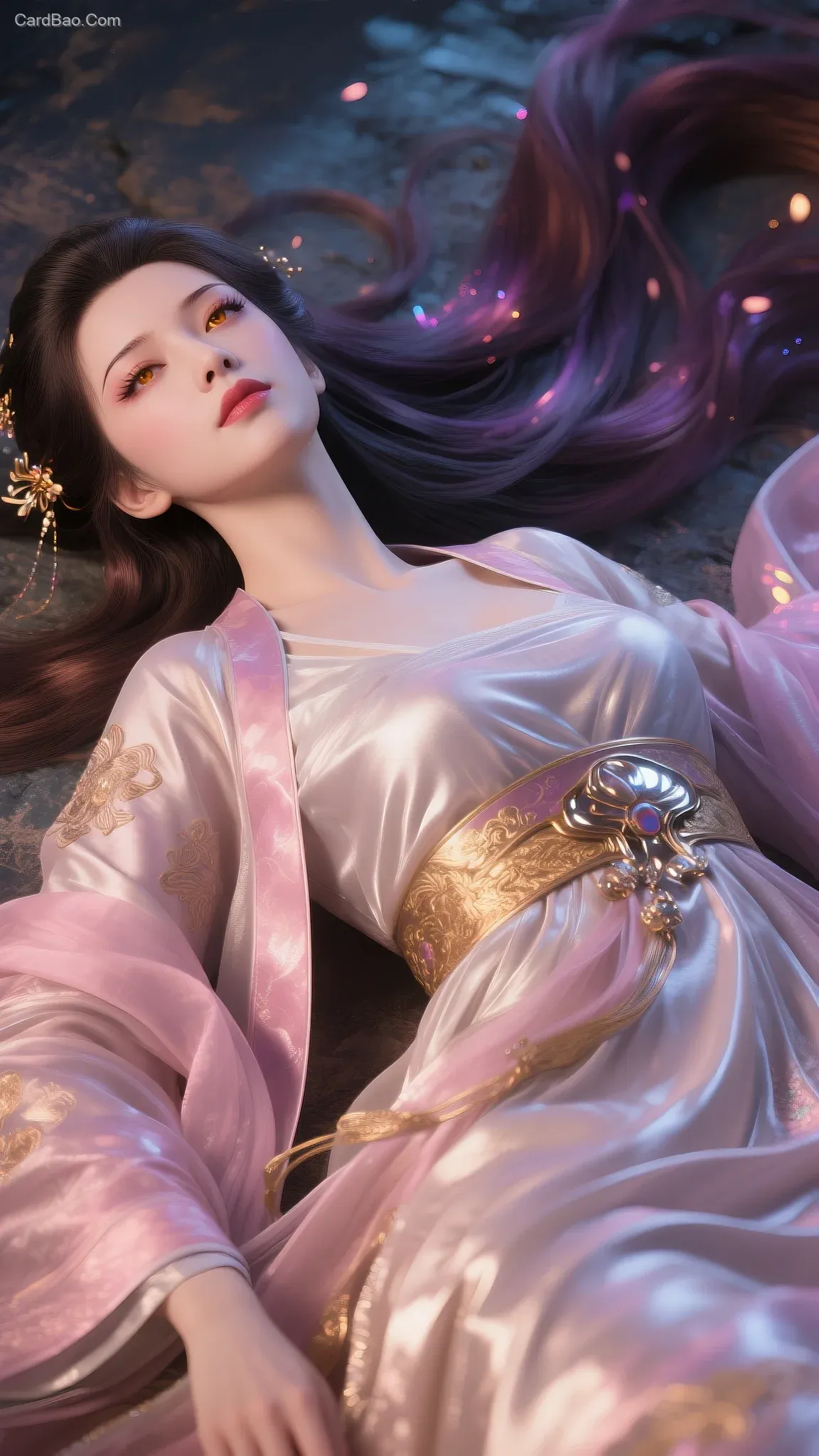 **Character Setting**: Mature Eastern femme fatale, charming and languid, with a mysterious and alluring smile, seductive eyes with long, distinct eyelashes, stunning amber pupils, lying on her side.