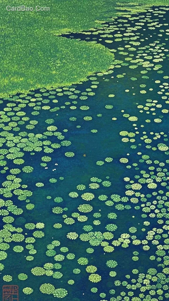 一幅点彩画,俯瞰镜头,布满墨绿色水草的湖面,波光粼粼,点彩、郁郁葱葱为特色,宁静的气氛。