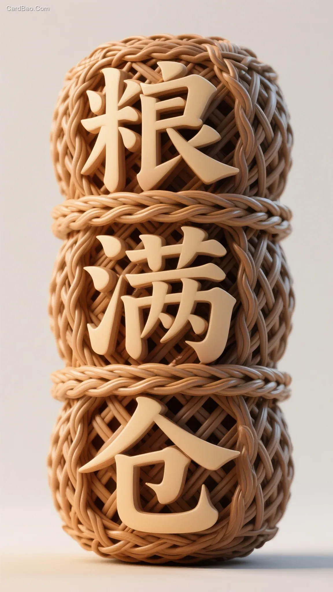 竖排立体汉字"粮满仓”整体表面抛光藤条复杂花式双层编织字体纹理效果,结构致密,纹理整齐,高质感3D渲染,超高清细节展现同纹渐变色彩,极简纯色背景,柔和顶光营造立体感,微距视角搭配景深虚化效果