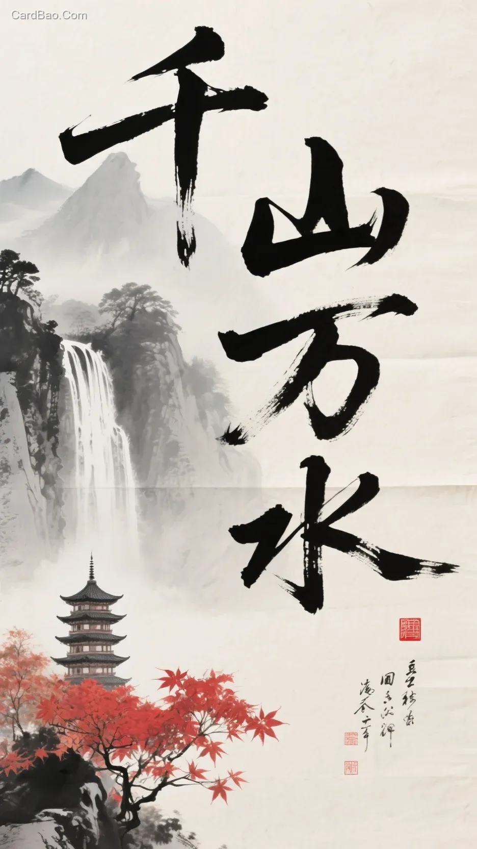 狂草书法作品,狂草字体,字体洒脱飘逸,苍劲有力,飞白,内容为“千山万水”,以大意写,极淡吹墨,水墨艺术融合成空灵,孤寂,高山,瀑布,寺庙塔,红色的枫叶,国风,亮银,朦胧美为背景,右下角朱红小方块印章,超高清真实画质