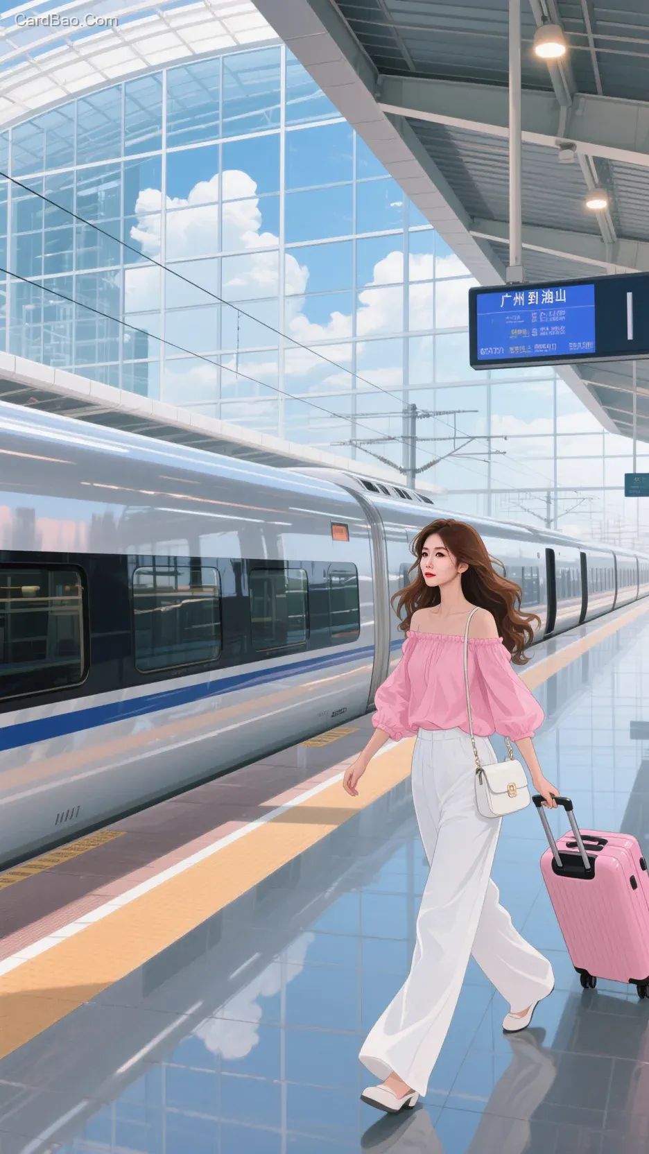 ##现代高铁站全景,流线型银色列车停靠在站台,通透的玻璃幕墙反射蓝天白云,站内电子屏显示车次信息,广州到汕头,匆忙旅客拖着行李箱行走,广角镜头展现站厅纵深感,4K画质呈现金属反光与玻璃折射的细节,冷色调搭配暖色灯光营造科技未来感,一个女生,棕色长卷发,粉红色漏肩雪纺衬衫,白色阔腿裤,白色小包,拎着粉色行李箱,在候车,治愈系插画
