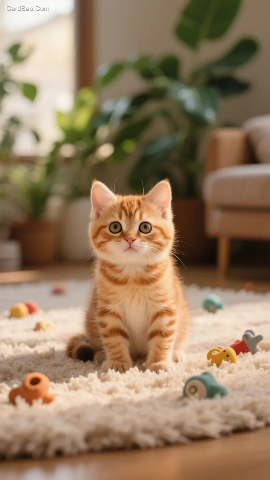 生成一只可爱小橘猫的治愈系日常,圆脸大眼睛的橘色虎斑幼猫(绒毛质感+真实光影)