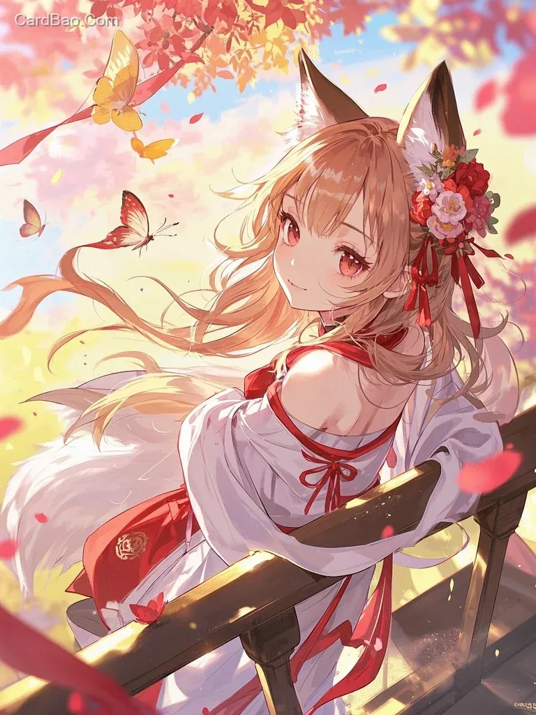 可爱狐耳少女,长发配花头饰与流苏,身后有蓬松狐尾。面容甜美,眼眸温柔泛红晕。身着中式古风衣衫,宽袖系红带。背景是飘着花瓣、有蝶飞舞的梦幻场景,整体为高质量动漫风,细节精致,色调柔和甜美 ,画面超清,细节精致。锁骨,纱衣,光影交错,暧昧,发烧,意乱情迷。唯美,二次元,现代风格,数字艺术风格,彩铅画,淡雅色调、柔美神秘。8K。梦幻,悲伤,忧郁,暧昧,浅色系,抽象艺术,近景,高清,细节