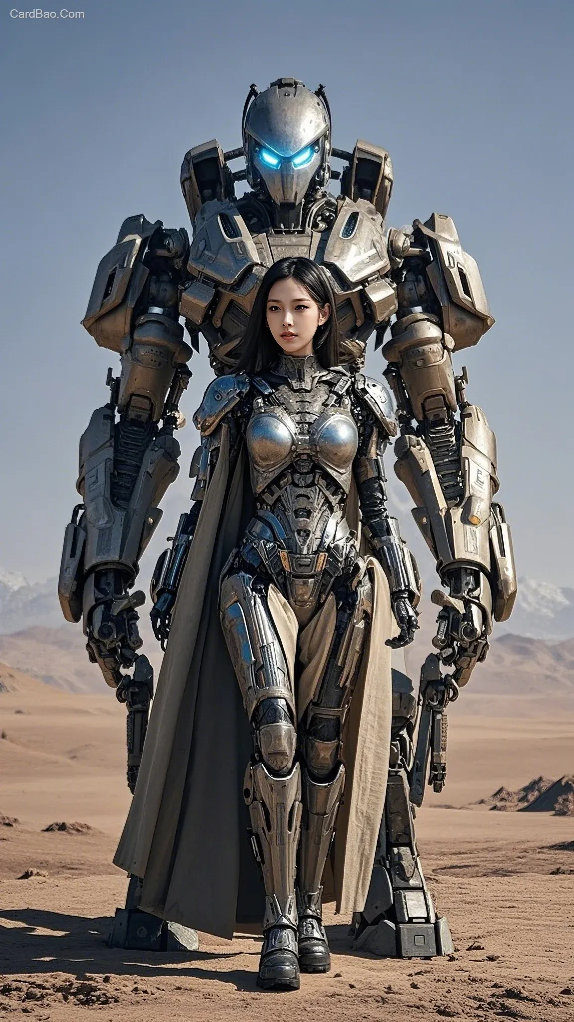 ## Foreground model. Featuring a bionic-style exoskeleton design made of metal materials, robe attire, post-apocalyptic style, desert background, tall mecha robot in the background, portrait photography, metallic color scheme.