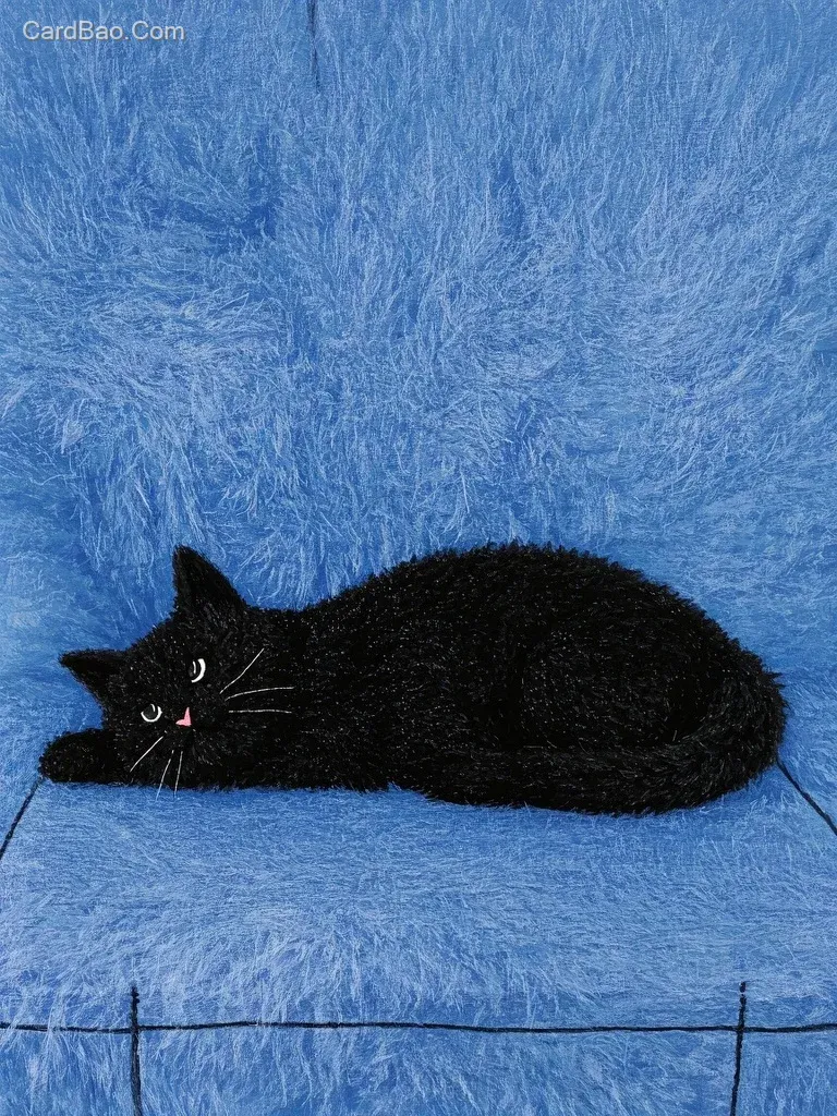 羊毛毡绘本,画面表面浓密负载的毛毡绒毛纹理,极简扁平写意的画风,神秘宁静,细毛细小琐碎,画面覆盖一层细小的毛发,起毛的效果,毛毡工艺画,用细小绒毛组成一个趴在沙发上睡觉的黑猫。图片风格为写真,