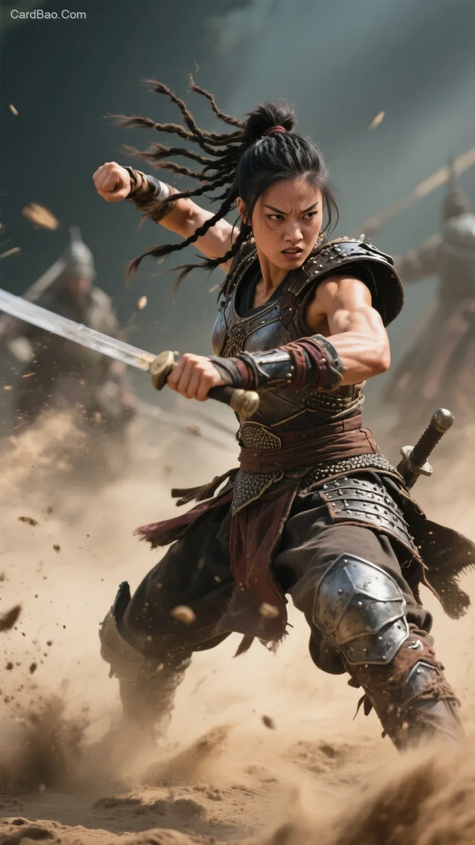 中国肌肉脏辫女狂战身着铠甲,正施展凌厉的武打动作,身形矫健,表情凶狠,周围尘土飞扬,武侠风,中景,激烈,英武