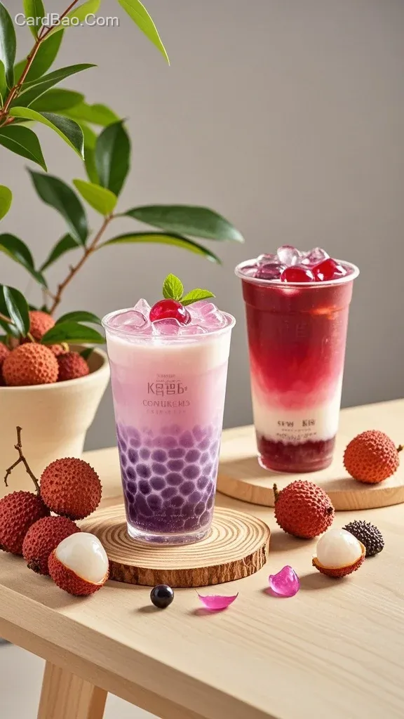 室内温馨场景,浅木色桌面为底。前景摆放两杯高颜值特调饮品,左侧透明杯置于木质圆片上,杯内分层:底层深紫珍珠,中层粉白荔枝果肉、粉色心形果冻,杯口装饰带绿叶红壳荔枝。右侧透明杯是渐变紫饮品,杯顶有粉紫水晶状爆珠、红心造型装饰。周围散落新鲜荔枝(带壳、剥开的)、深紫小圆果,还有粉色花瓣点缀。背景左侧有浅米色花盆,内有绿叶植物,盆边露出深色小果子。整体光线柔和,营造出清新、甜美的夏日氛围 ,色调以粉、紫、浅木色为主 。