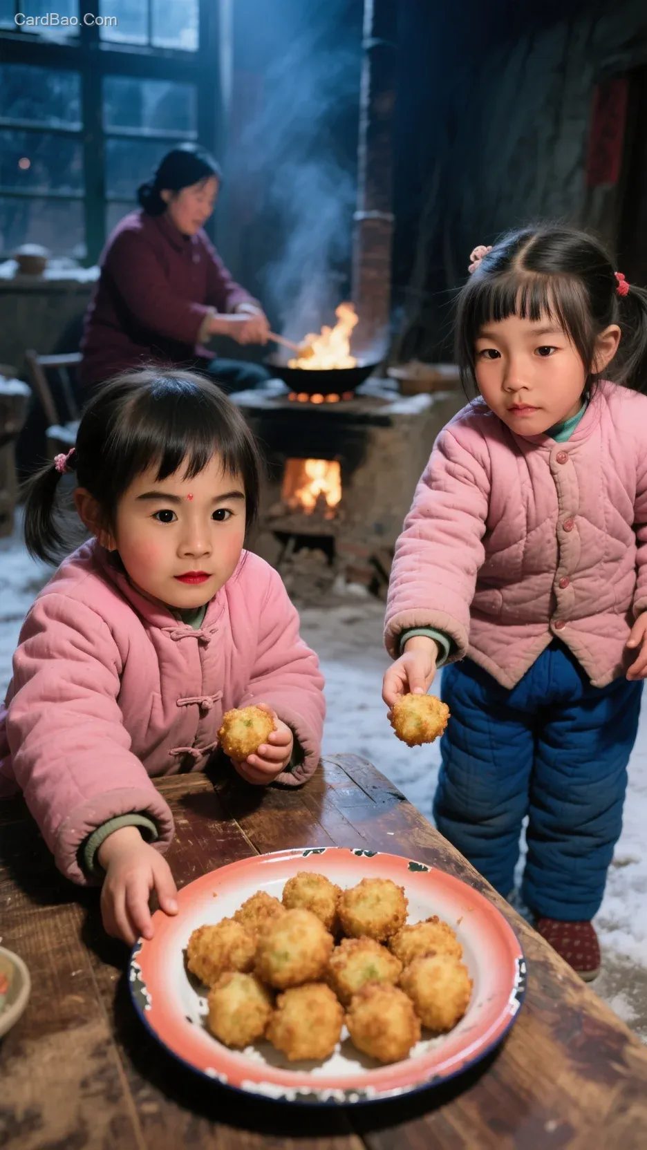 In a rural winter night during the 1980s, on a wooden table, a freshly fried batch of radish balls sits in an old enamel plate. A little boy pulls the plate toward himself, covering the radish balls with both hands. Beside him, a little girl angrily reaches out to grab the balls. In the background, their mother is frying more radish balls at an earthen stove.