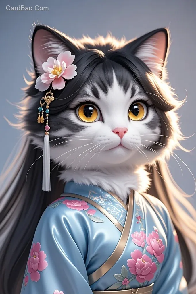 古风拟人美短起司猫咪,黑白灰的毛发。全身毛茸茸的。拟人美短起司猫咪。马克笔彩绘插画动漫3D头像,国色天香,绝美容颜,浅棕色眼懵清晰纯净,,五官精致。黑棕色长发,简单漂亮的发型,头发上戴着一朵花形花朵发饰,额头上没有装饰,淡蓝色真丝古风纱裙,发光的服饰。手上粉红色牡丹花,背景极简,半身照,眼神柔美,正面视角。精致唯美,细节丰富,光影柔和,8K超高清画质。超级真实