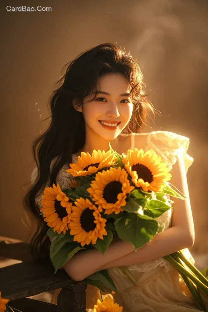 高清人像,以专业人像摄影风格呈现,专业人像摄影风格的照片。画面以复古橙色调为主,充满文艺、故事与情绪感。主体是微笑着抱着一束盛开向日葵的女性。采用全景展示,光线营造出朦胧梦幻氛围,有光影和发光效果,呈现超高清、高画质。