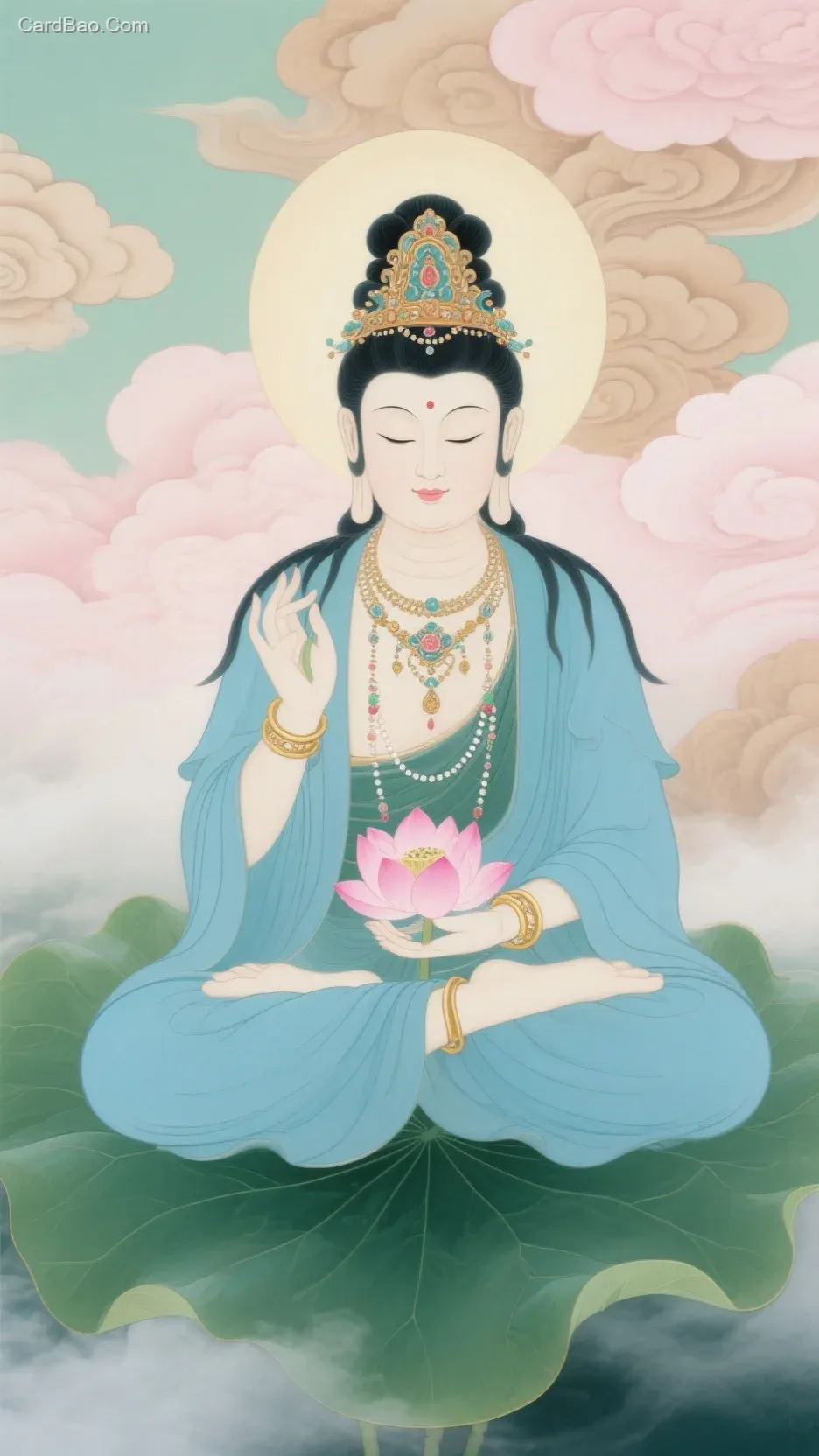 - 人物形象:图中主体是一位具有传统宗教艺术风格的人物,疑似观音菩萨。她面容端庄祥和,双目微闭,神态宁静慈悲 ,传达出超凡脱俗之感。发髻高挽,头戴华丽宝冠,冠上装饰细节虽简约但精致,彰显华贵。