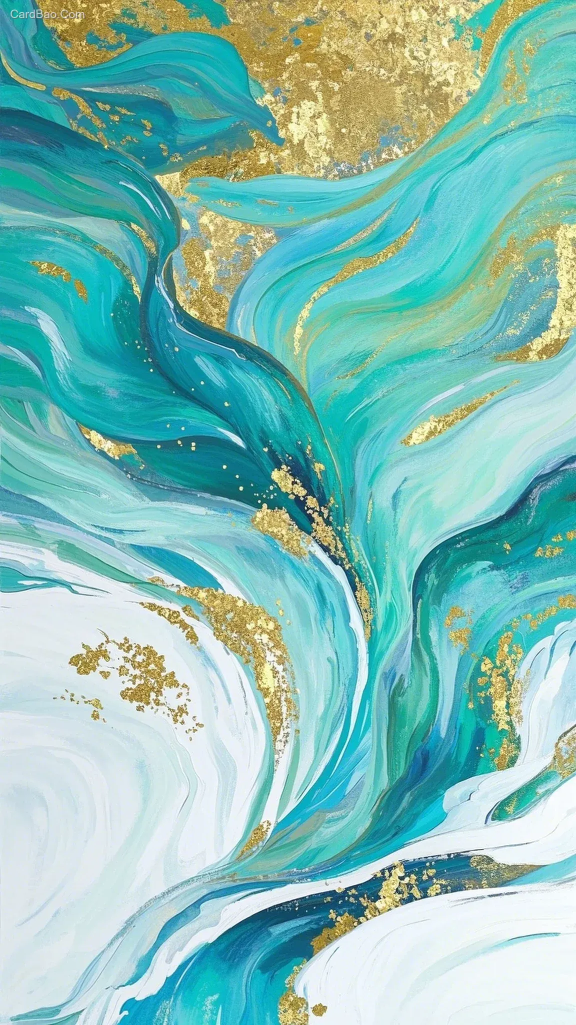 抽象的海浪,蓝绿色与金色闪粉,白色背景,细节丰富。