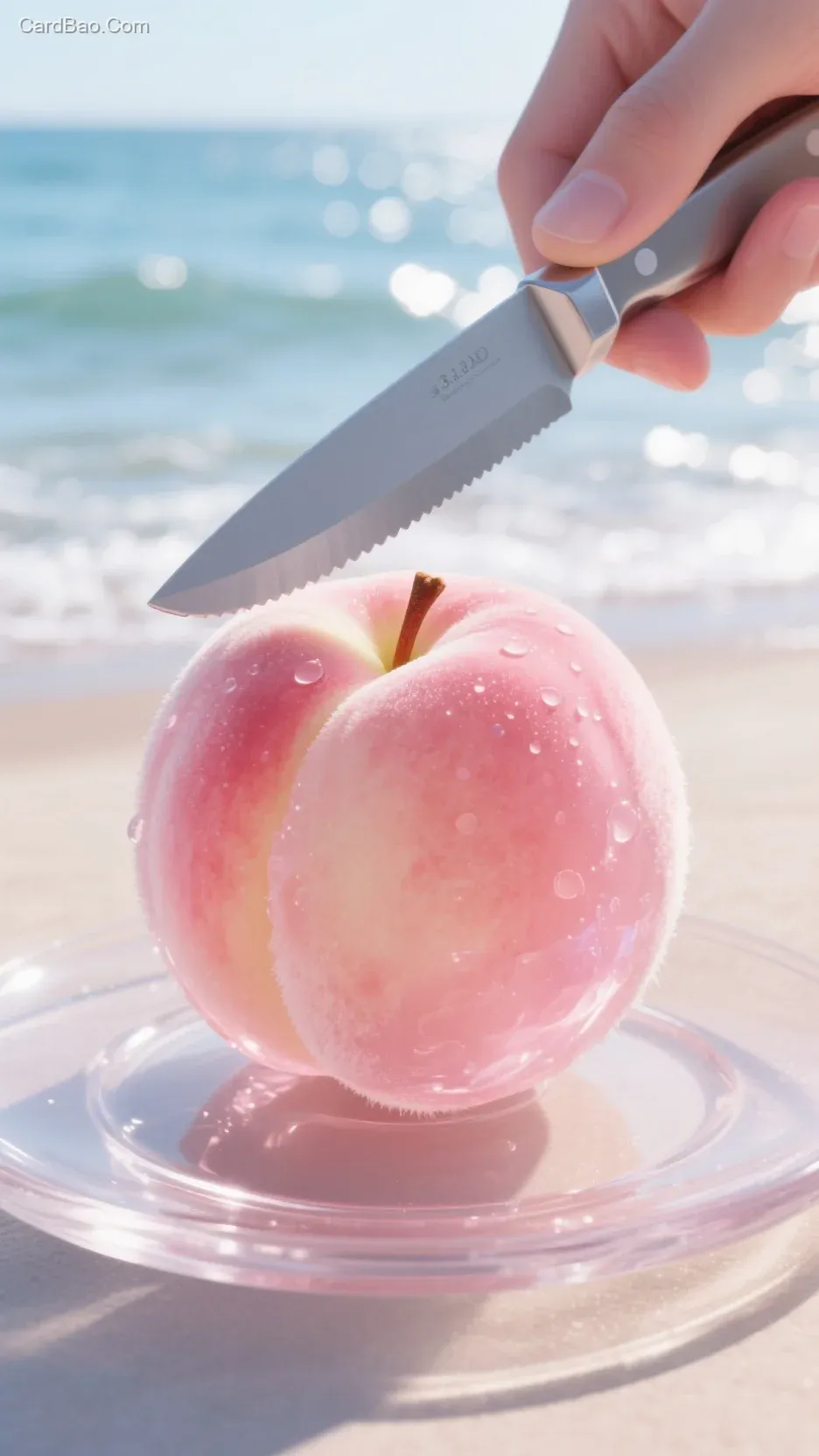 Close-up shot. 3D rendering. The main subject of the image is a pink jelly-like peach, entirely transparent, crystal clear, and intact, with water droplets or glitter effects on the surface, and fine fuzz. Above the fruit, a hand holds a silver-gray metallic knife: 1.3, with a blade as thin as paper, a polished mirror-like surface, and a cold, reflective shine, poised to cut the fruit. The fruit is placed on a transparent glass plate, with a shimmering seaside scene in the background. The sunlight is bright, creating a healing and luminous overall atmosphere, rendered in 8K hyper-realistic style.